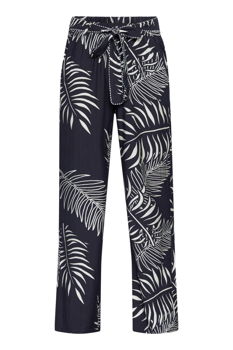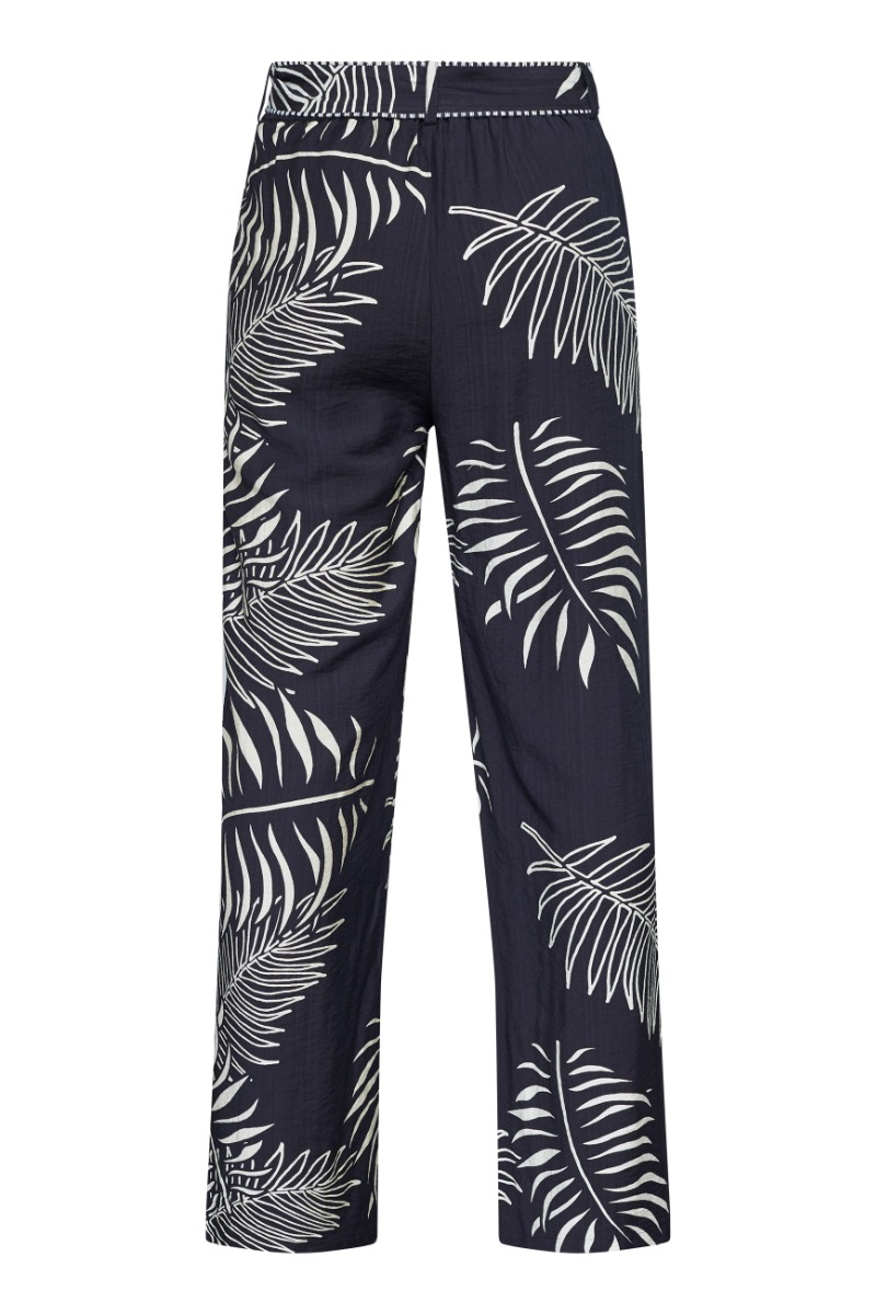 Et par virkelig fine bukser fra Sisters Point i en sort bundfarve, hvorpå der er de fineste bladformationer i en hvid farve. Bukserne her er med vidde i benene, elastik i taljen og bindebånd i livet. Style dem til den matchende bluse eller en anden overdel.