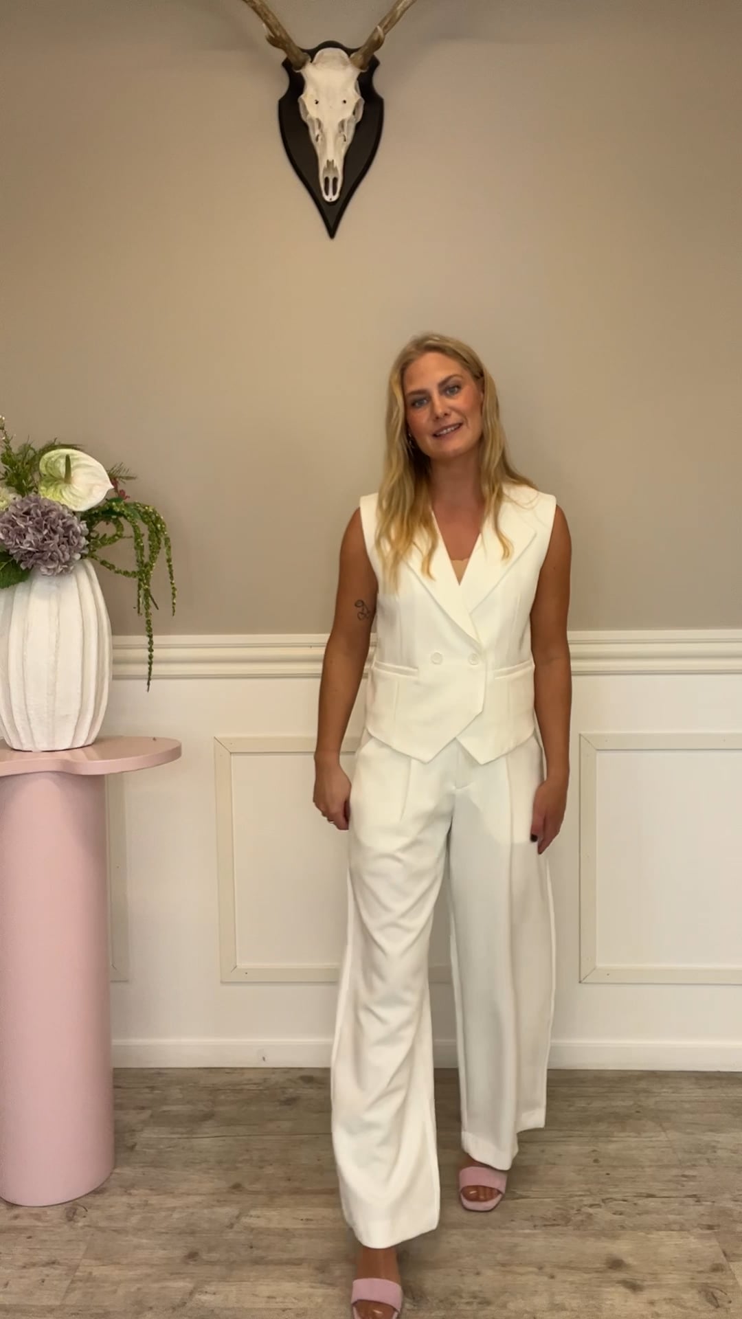 Bukserne har et elegant og klassisk udtryk i en lys, offwhite nuance. De er højtaljede med en glat linning og lukkes diskret foran, hvilket giver et rent og stilfuldt look. Pasformen er let løs med lige, lange ben, der falder flot og skaber en strømlinet silhuet. Stoffet fremstår blødt og struktureret med et pænt fald, som gør bukserne både komfortable og velegnede til et mere formelt udtryk. De kan nemt styles som del af et sæt med vesten eller kombineres med en enkel top for et sofistikeret hverdagslook.