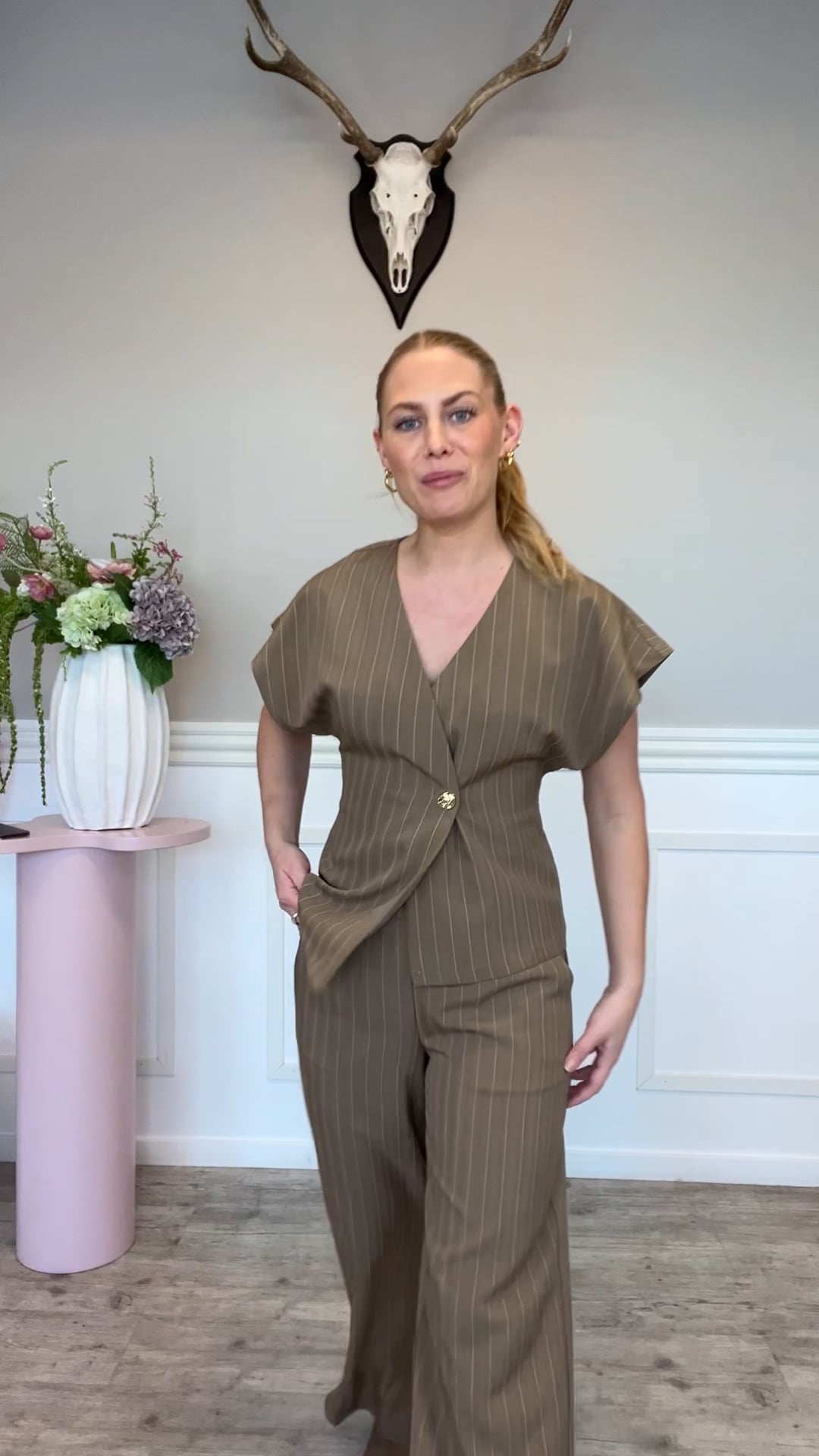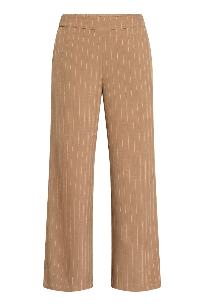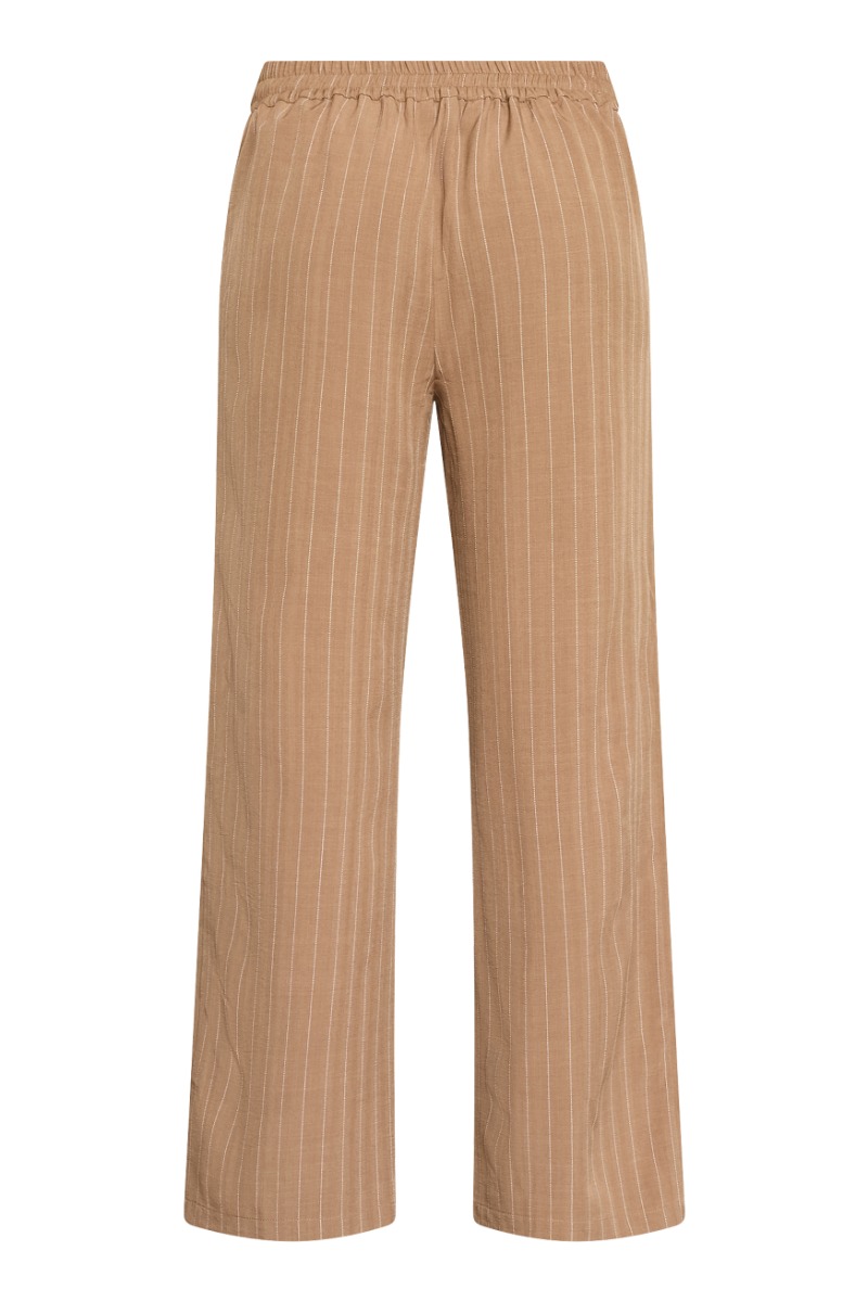 Elegante bukser i en varm sandfarvet nuance med fine lodrette striber, der skaber et slankt og sofistikeret udtryk; modellen har en behagelig elastisk linning, som sikrer en fleksibel og komfortabel pasform, mens de lige, vide ben giver et moderne og afslappet fald. Det lette materiale gør bukserne velegnede både til hverdagsbrug og mere formelle anledninger, hvor de nemt kan styles med en skjorte, top eller blazer for et stilrent og gennemført look.