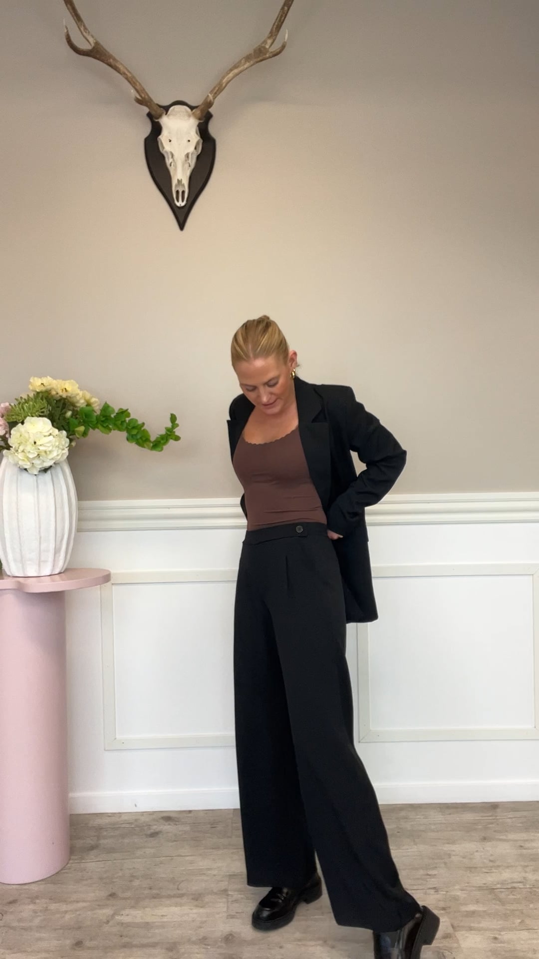 Et par bukser fra Sisters Point er kommet i sort og har denne lille detalje ved bæltekanten hvor den knappes ude på siden i stedet for i midten. De er med vide i benene og kan styles til hvilken som helt overdel. Man kan altid bruge et par sorte bukser i garderoben.