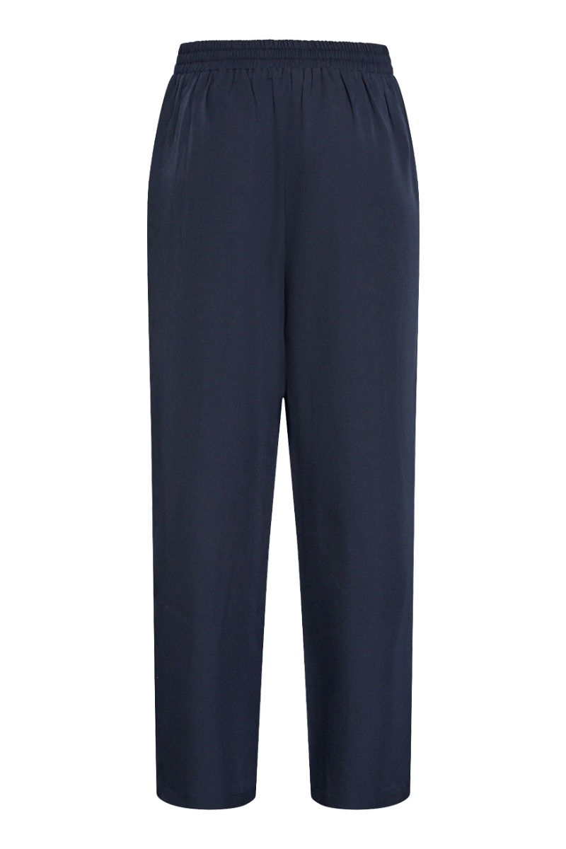 Bukserne er i en mørk navyblå farve og har et klassisk, tidløst udtryk. De er designet med lige ben og et let, elegant fald, som giver et afslappet men stadig sofistikeret look. Taljen har en elastisk linning bagtil, der sikrer god komfort, mens fronten er glat og enkel for et mere poleret udtryk. Et par alsidige bukser, der fungerer lige godt til hverdagsbrug og til mere formelle anledninger.