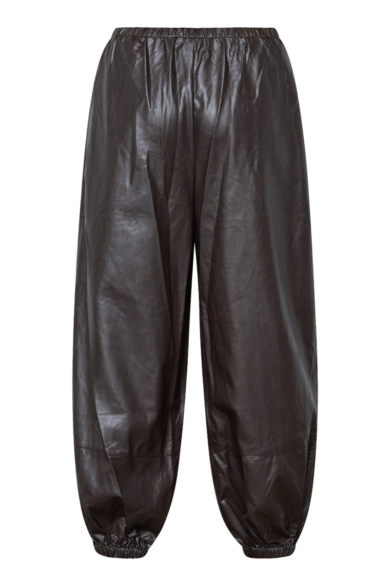 Brune bukser i blød læderlook kvalitet med en løs og afslappet pasform, designet med elastisk talje og elastik ved anklerne som giver en let ballonformet silhuet, mens de lodrette syninger foran tilfører et enkelt og moderne udtryk, hvilket gør dem velegnede både til hverdagsbrug med strik og sneakers eller stylet mere elegant med skjorte og støvler.