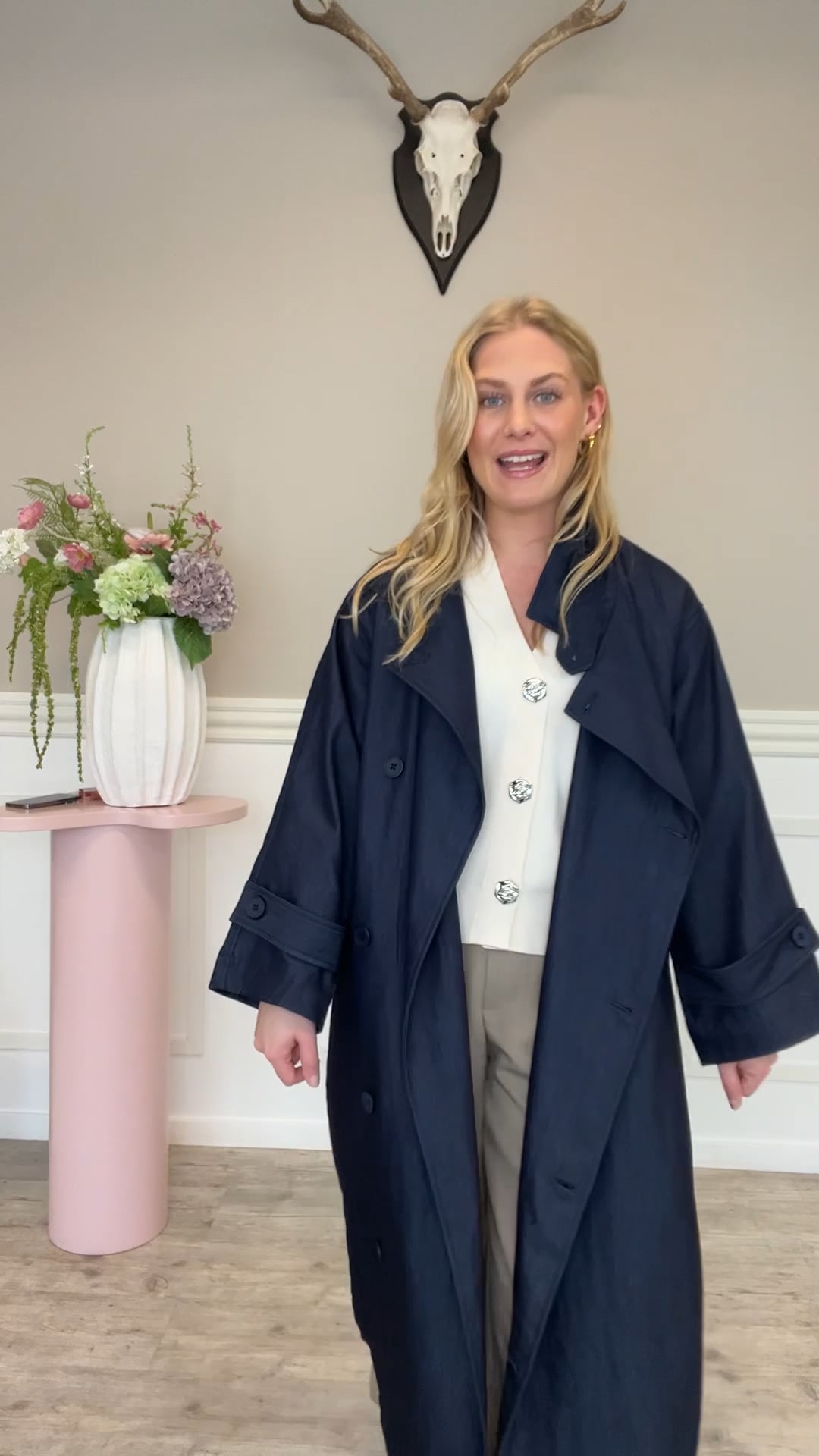 Lang og stilren trenchcoat med et moderne og minimalistisk udtryk. Jakken har en høj krave med knaplukning, som giver et elegant og let struktureret look, samtidig med at den beskytter mod vind. Den asymmetriske knaplukning foran tilfører designet kant og gør modellen ekstra interessant. Ærmerne er brede med justerbare manchetter, der giver et afslappet og komfortabelt fit. Den lige silhuet og det lette materiale gør frakken ideel som overgangsjakke, hvor den både kan styles casual til hverdag eller mere klassisk over et pænt outfit.