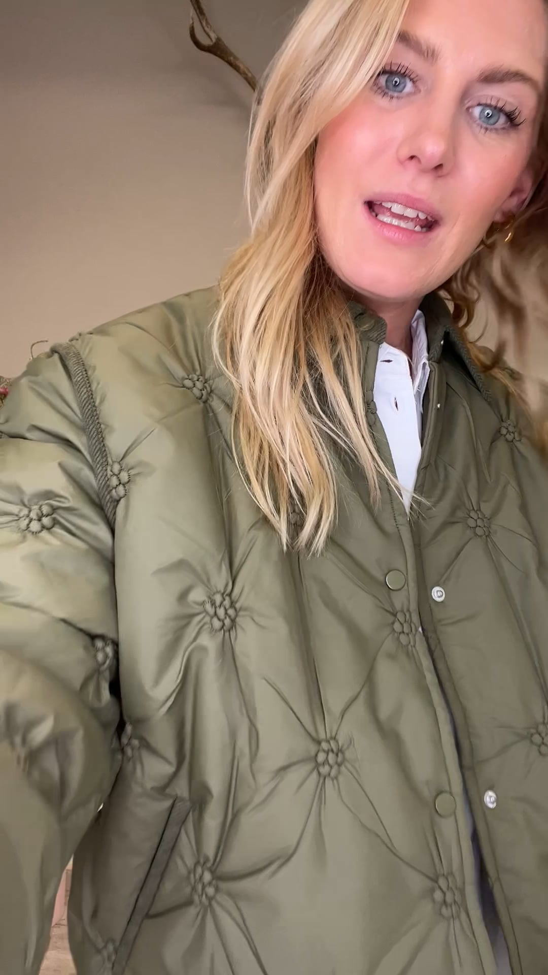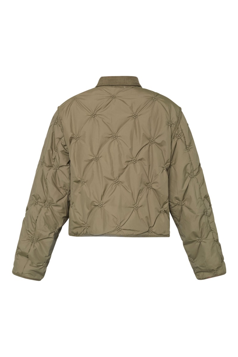 En fin overgangsjakke fra Sisters Point er klar til denne sæson. Den er med quilt look, og samles i noget der ligner små blomster. Den har klassisk skjortekrave og lukkes med trykknapper.