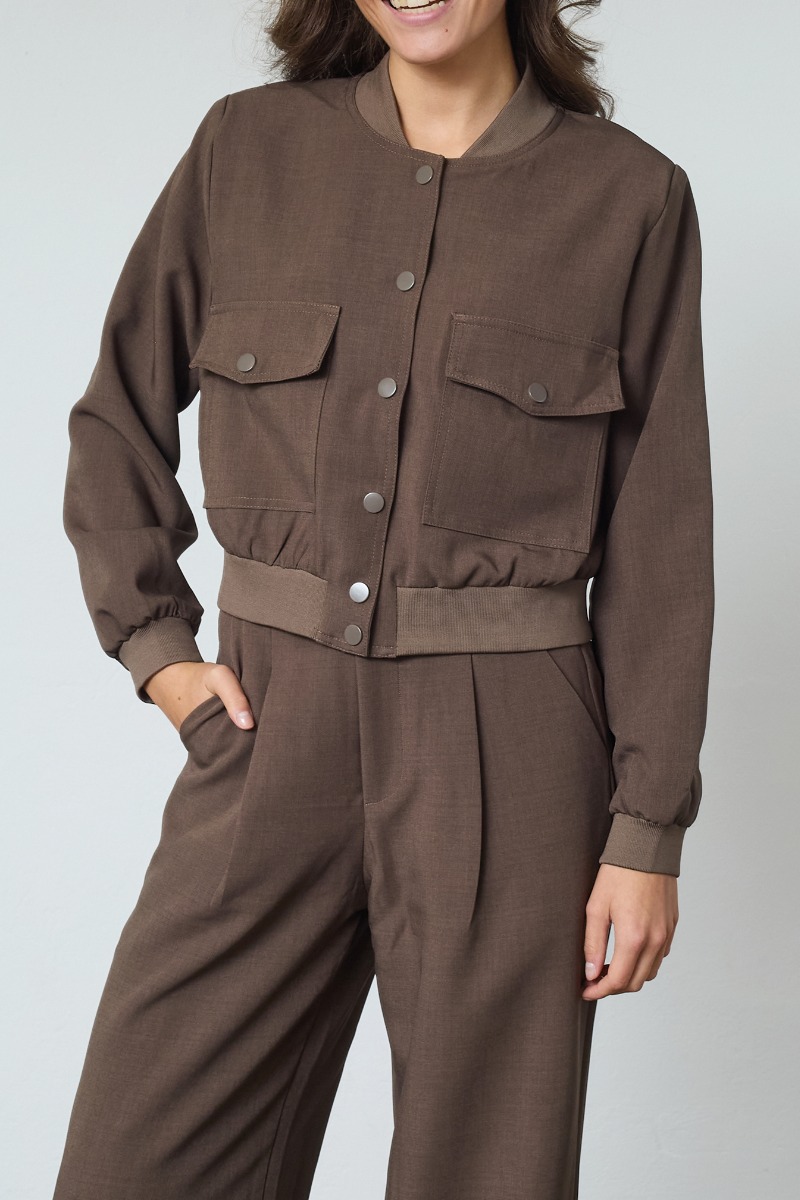 Denne korte jakke har et stilrent og moderne udtryk i en smuk brun nuance, der passer perfekt til sæsonens garderobe. Den er designet med trykknapper foran og to store brystlommer, som giver et cool og praktisk look. Jakken har ribkanter ved hals, ærmer og bund, der skaber en afslappet bomber-inspireret silhuet. Den lette kvalitet gør den behagelig at have på og nem at style både inde og ude. Et alsidigt item, der fungerer perfekt sammen med matchende bukser eller dine favoritjeans.