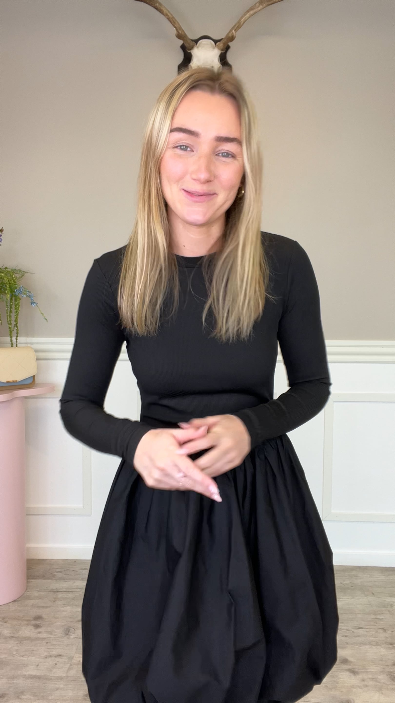 Enkel og feminin kjole fra Sisters Point. Kjolen har lange ærmer i et tætsiddende materiale. Denne kjole giver dig illusionen af en bluse sammensat med en nederdel. Den kan både styles op og ned, alt efter anledning. Brug den til hverdag evt. med er par sneaks, eller til fest med en lille hæl.