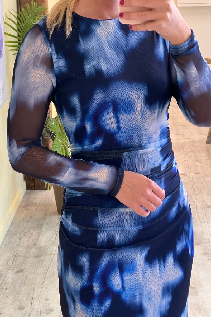Endnu en flot Esme kjole fra Sisters Point. Kjolen har de flotteste blå farver i et sløret og blandet mønster. Den har lange ærmer og sidder tæt til kroppen, som skaber en fin silhuet.