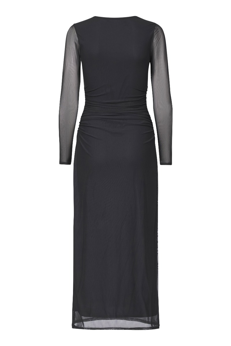 Denne elegante kjole fra Sisters Point er en tidløs model, der kombinerer klassisk stil med moderne detaljer. Kjolen er sort og fremstillet i et let, transparent mesh-materiale med en blød underkjole, som giver et sofistikeret og flatterende udtryk.Den har lange, let gennemsigtige ærmer og rund halsudskæring. I taljen og på hofterne er der smukke draperinger, som fremhæver figuren og skaber en elegant silhuet. Kjolen har en midi-længde, der gør den perfekt til både festlige begivenheder og aftenarrangementer.