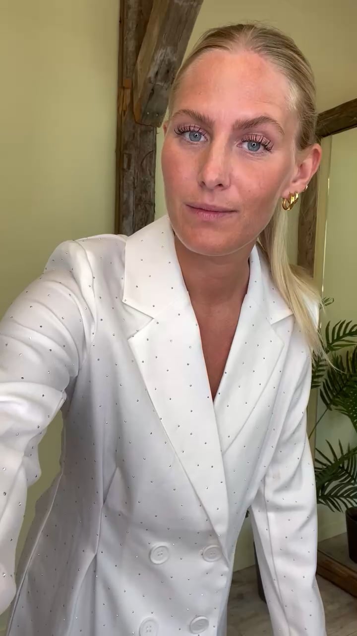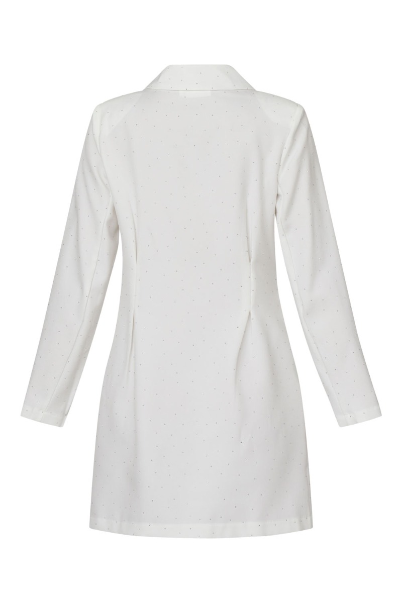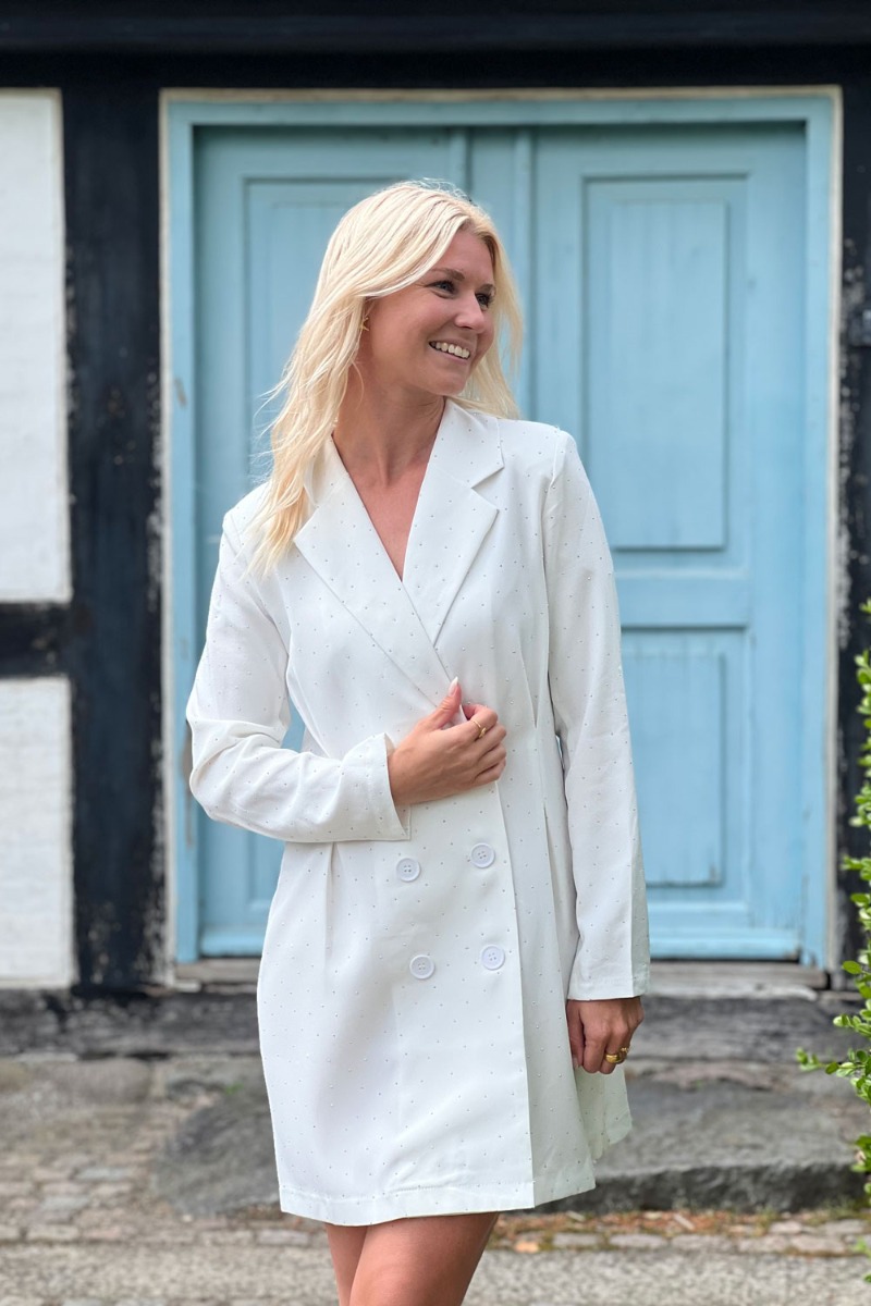 En smuk kjole fra Sisters Point i hvid med små sten limet på. Den er i en habit/blazer look. Og lukkes foran med knapper samt har klassisk blazer krave. Den er tætsiddende og kan nemt styles til et par stiletter til fest.