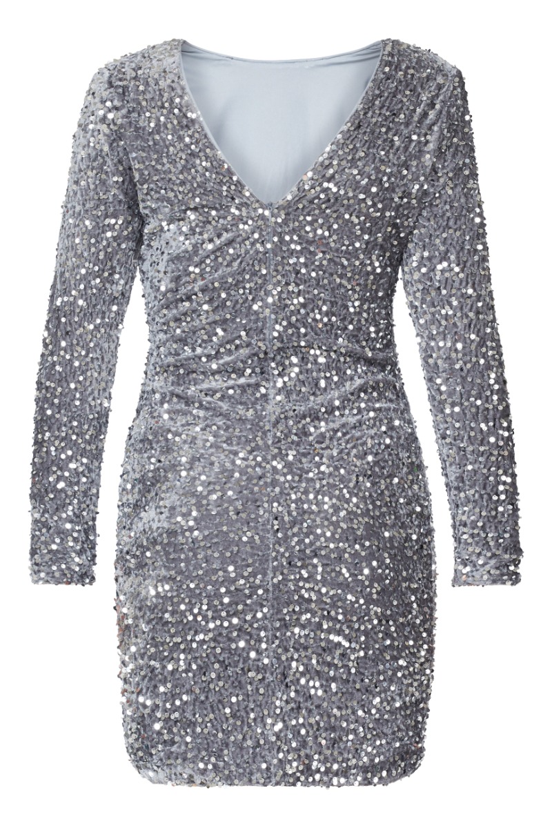 En utrolig flot og festlig kjole fra Sisters Point, som er helt perfekt til de mange festligheder, som lurer lige om hjørnet! Denne kjole er prydet med sølvfarvede palietter, har lange ærmer og en lille udskæring på ryggen. Kjolen lukkes med lynlås i ryggen, så den er super nem at komme i.