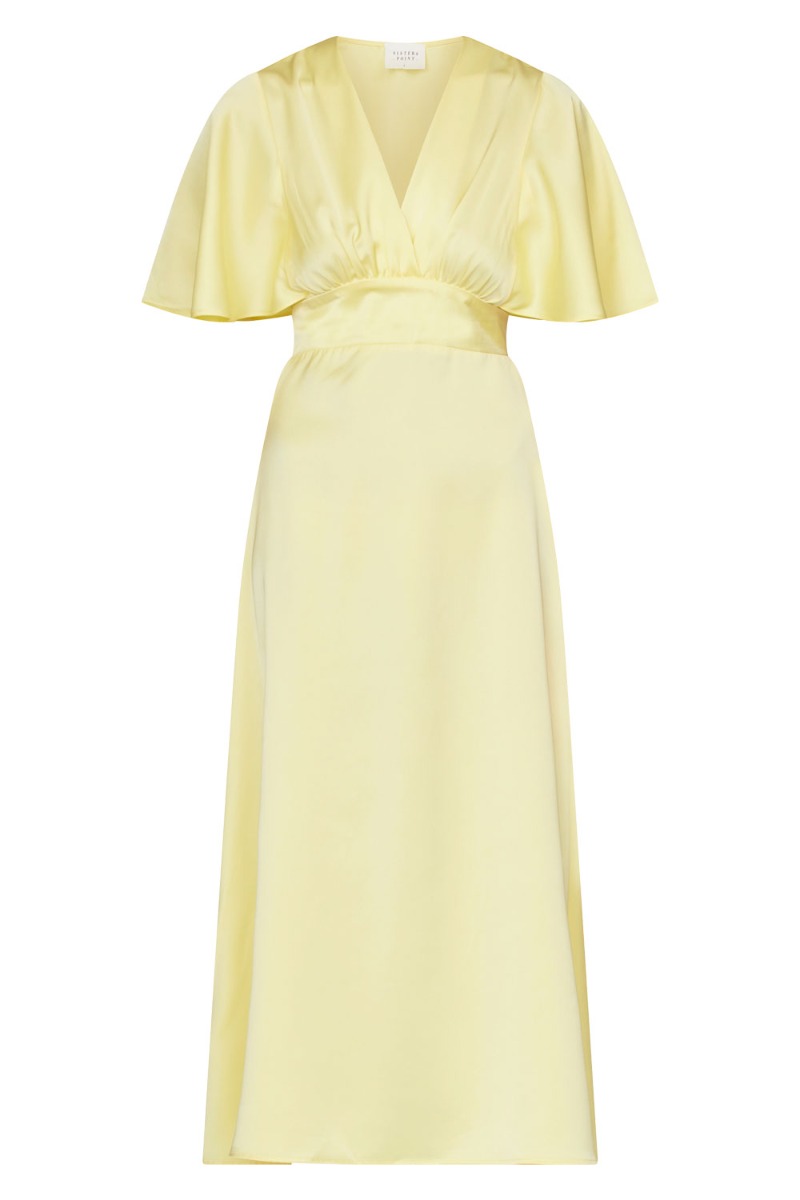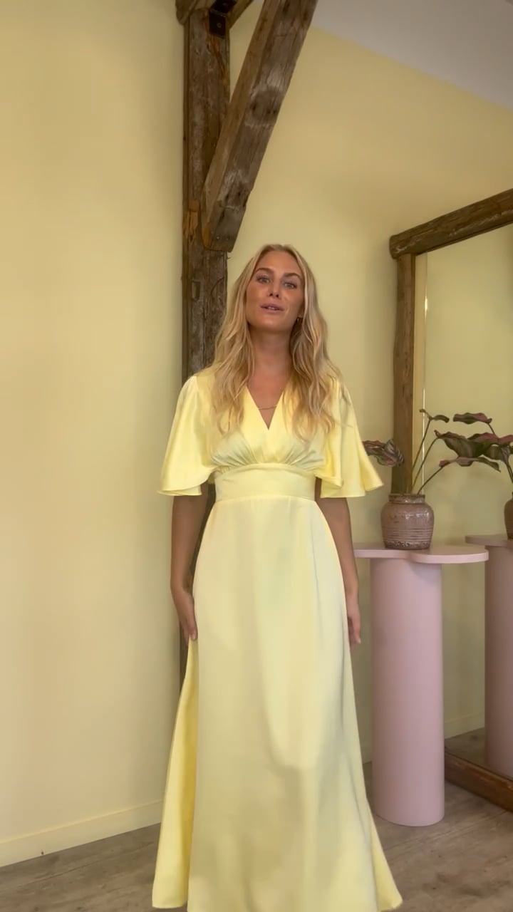 En smuk kjole fra Sisters Point i en lækker satin kvalitet er kommet i lys gul farve. Den er med V hals og korte brede ærmer. Derudover er den A snit i bunden som gør at den falder smukt. Den vil være flot til fest med et par stiletter og kan også nemt styles ned med en sandal.