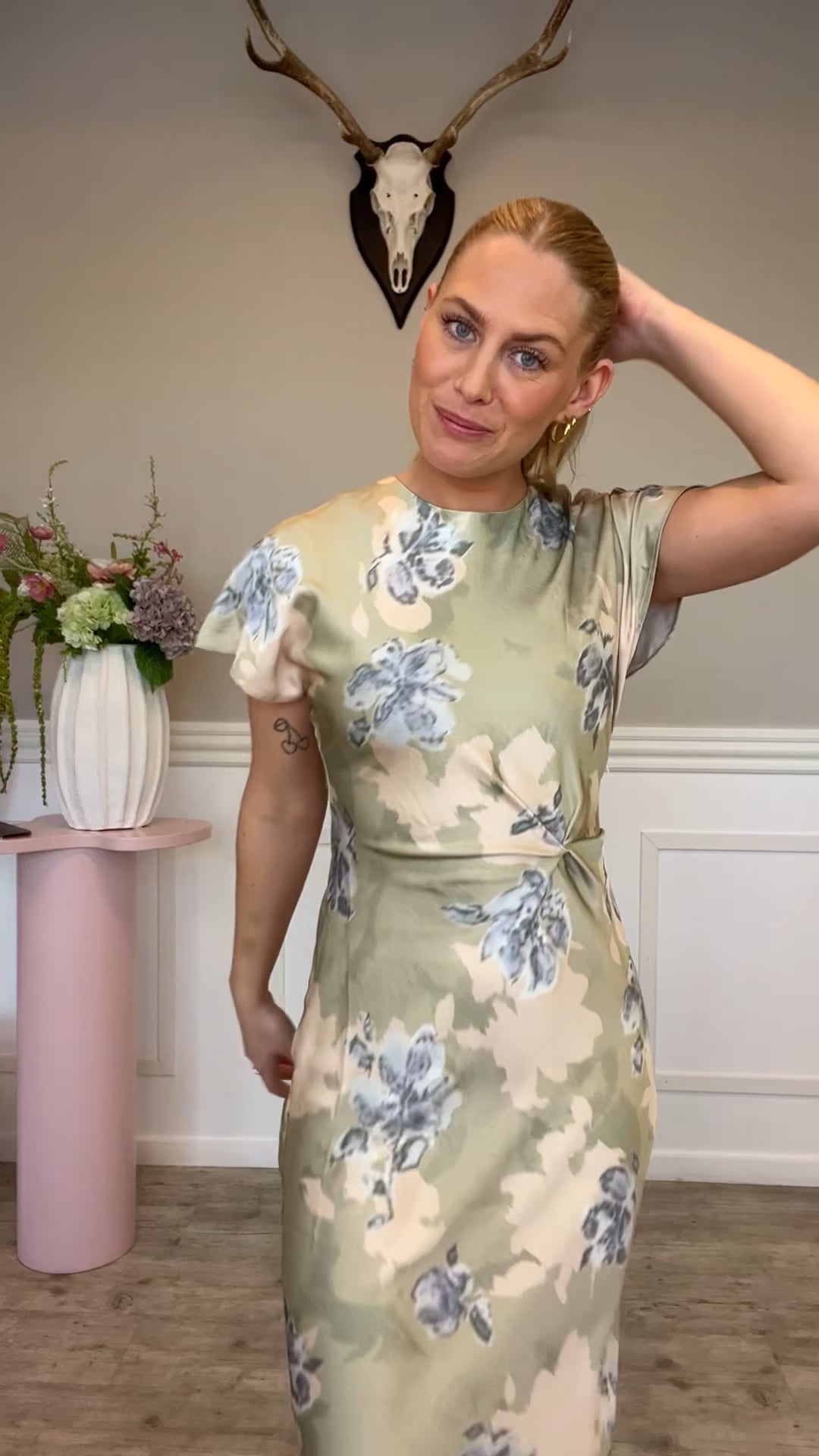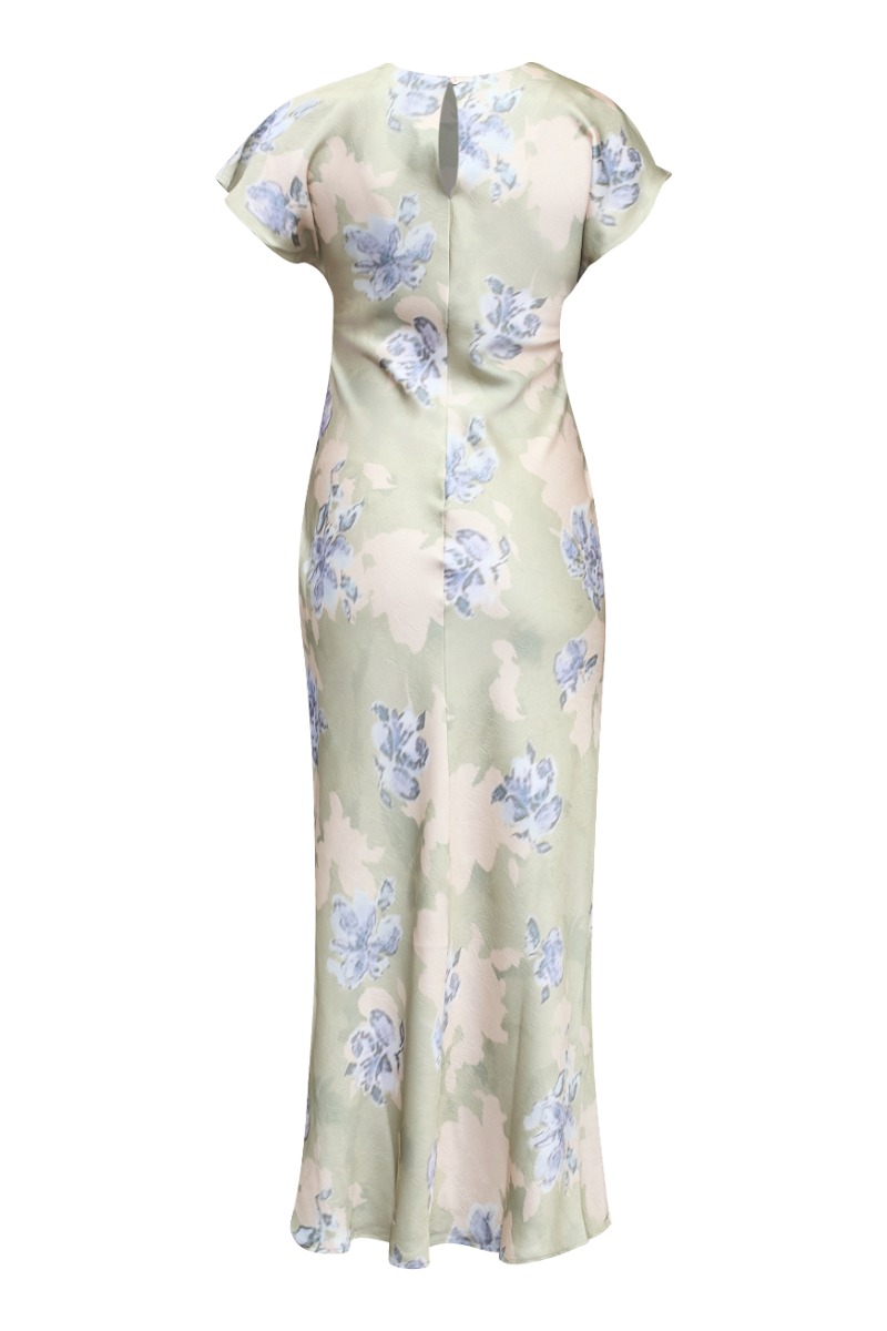 Lang kjole i et let og feminint design med blødt blomsterprint i afdæmpede grønne, beige og blå nuancer. Modellen har korte ærmer og rund halsudskæring, som giver et enkelt og elegant udtryk. Den diskrete drapering i siden skaber en flatterende silhuet og tilfører kjolen et fint twist. Stoffet falder let og giver et smukt flow ned langs kroppen, hvilket gør den behagelig at have på hele dagen. En alsidig kjole der kan styles både til hverdag med sneakers og til festligere anledninger med hæle.