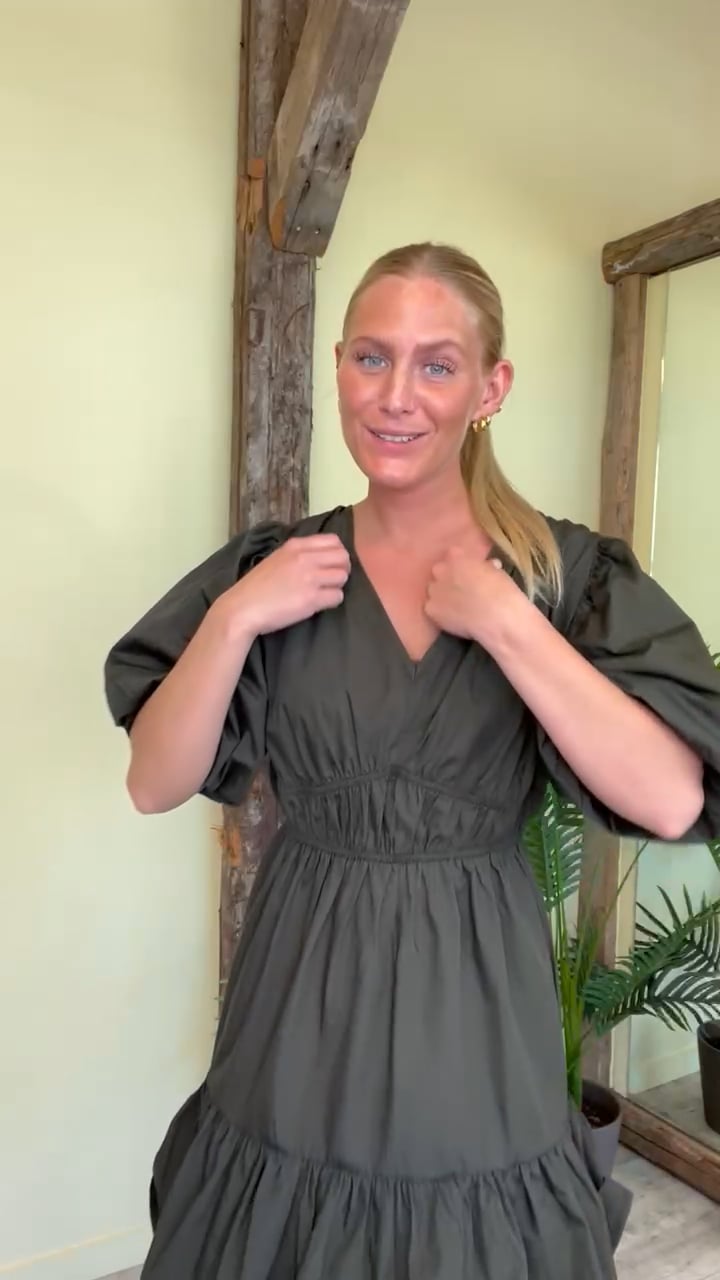 En sød kjole fra Sisters Point i army - det kan man altid bruge i garderoben- Den er med korte pufærmer og har elastik i taljen så den får dette A snit i bunden. Derudover er kvaliteten dejlig let og kan nemt bruges her til sommer med en sandal. Den findes også i sort.