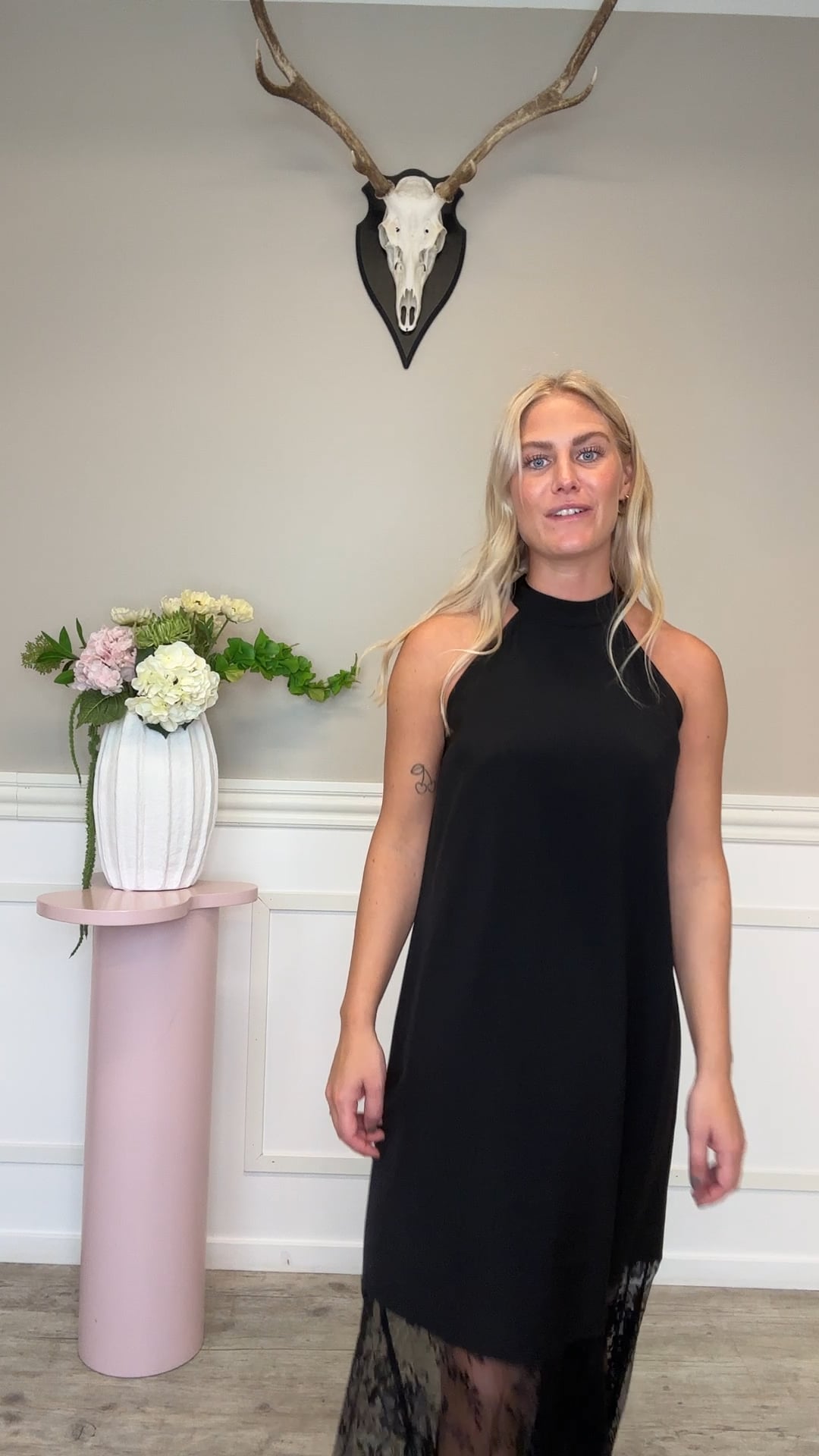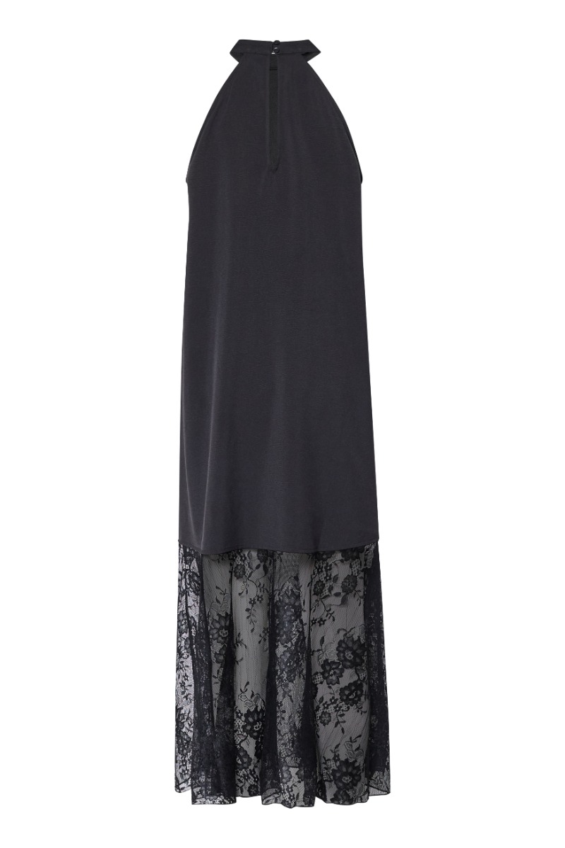 En smuk kjole fra Sisters Point er kommet til denne sæson. Den er med halterneck og lukkes i nakken med en knap. Derudover er den løs i snittet og derfor behagelig at have på hele dagen. I bunden er sat en lille blonde kant som giver et elegant look. Perfekt til fest!