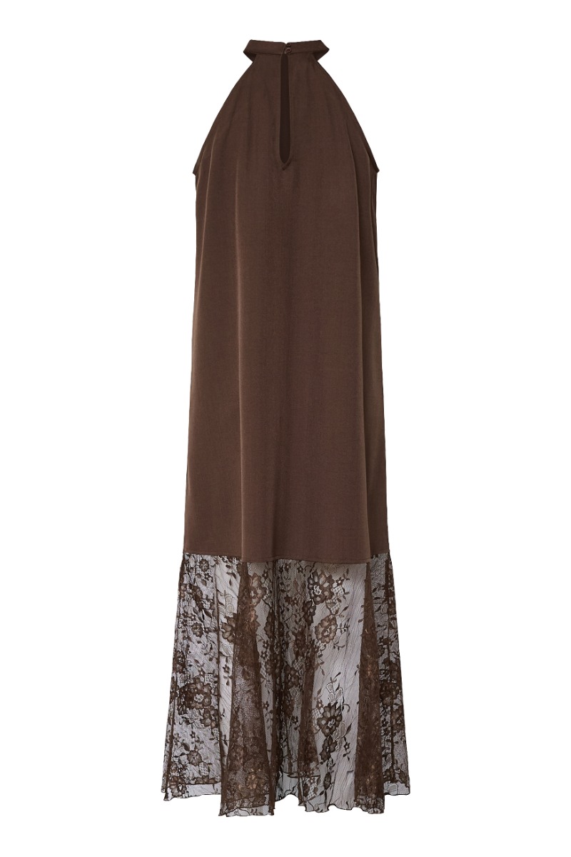 Kjolen er en elegant, brun halterneck-model med en høj hals og et enkelt, lige fald i stoffet. Det øverste stykke er lavet i et glat, ensfarvet materiale, som giver et minimalistisk og eksklusivt udtryk. Nederst går kjolen over i en lang, gennemsigtig blondekant i samme brune nuance. Blonden har et smukt, floralt mønster, som skaber lethed, bevægelse og et feminint touch.