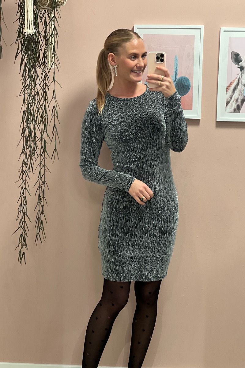 En virkelig fin og festlig kjole fra Sisters Point. Denne kjole er kort med lange ærmer og har en sølvfarvet glimmertråd. Den er så fin til et par strømpebukser og stiletter!