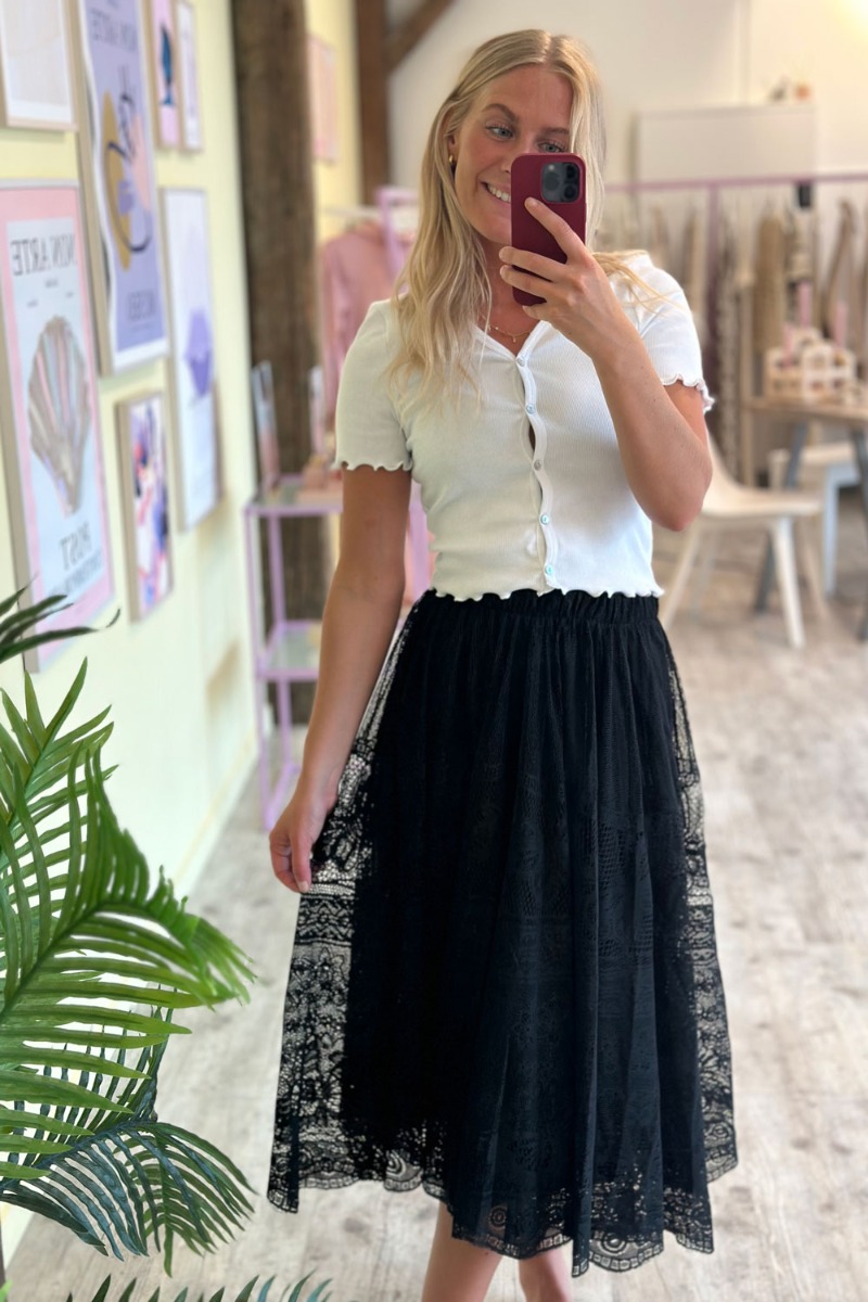 Den fineste nederdel fra Sisters Point. Der er elastik i livet og så er den lavet i et fint blondemateriale. Der er underskirt i, som gør at den ikke bliver gennemsigtig. Den går til lige under knæet og så findes den også i hvid.