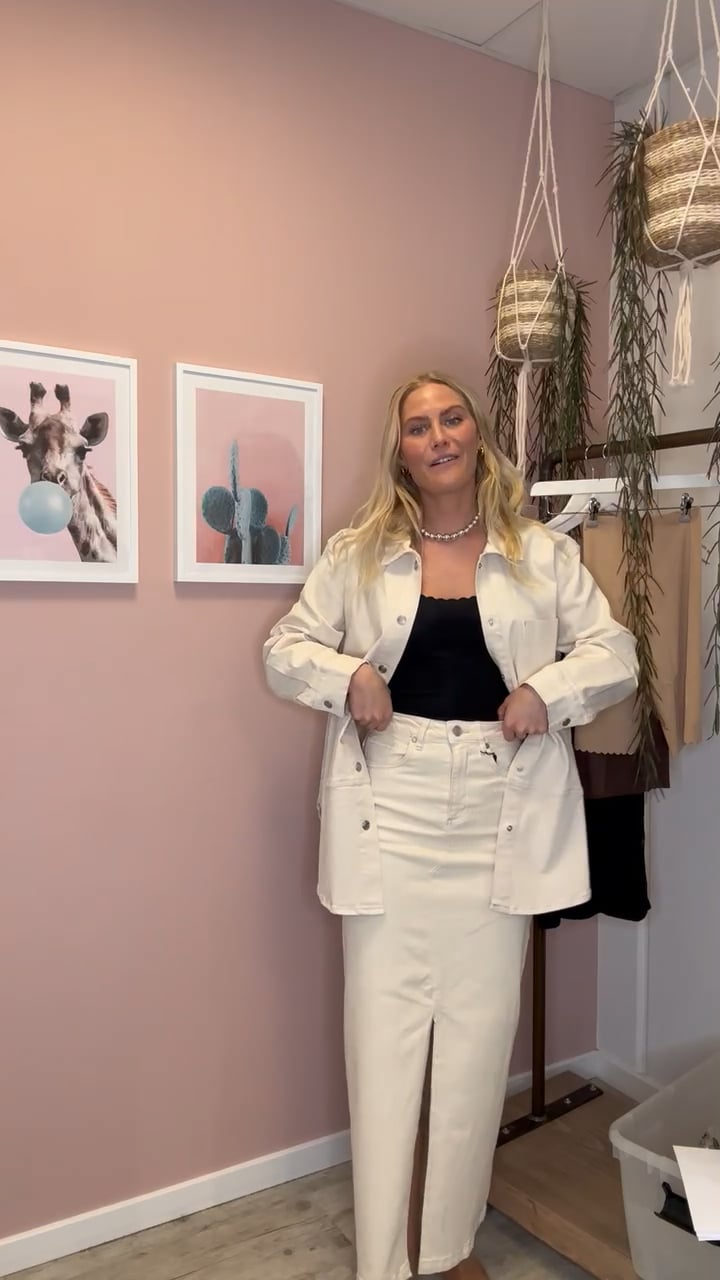 Beige denim nederdel fra Sisters Point. Nederdelen er med slids samt lommer foran. Derudover er den i et strækbart materiale, så den er dejlig behagelig at have på. Nederdelen findes også i en blå denimfarve.