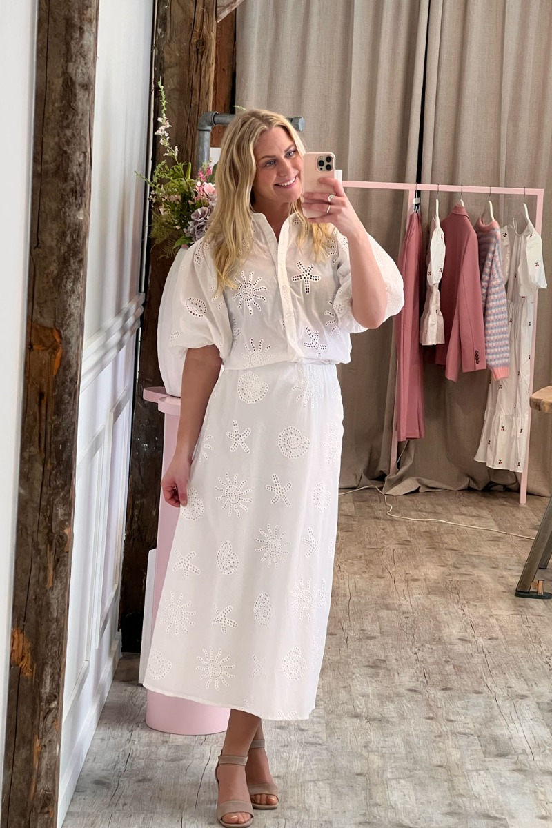 Skjorten er hvid og syet i et let, transparent bomuldsmateriale med broderet hulmønster, som giver et luftigt og feminint udtryk. Stoffet er dekoreret med fine, grafiske motiver inspireret af sole, stjerner og organiske former, der skaber struktur og et håndlavet look. Skjorten har en klassisk skjortekrave og gennemknapning foran, som giver et tidløst og anvendeligt snit. Ærmerne er korte og let puffede, hvilket tilfører volumen og et blødt, romantisk præg. Pasformen er afslappet med et lige fald, så skjorten både kan bæres løst eller styles nede i en nederdel eller bukser. Samlet fremstår skjorten elegant, sommerlig og alsidig – perfekt til både hverdagsbrug og mere pyntede anledninger.