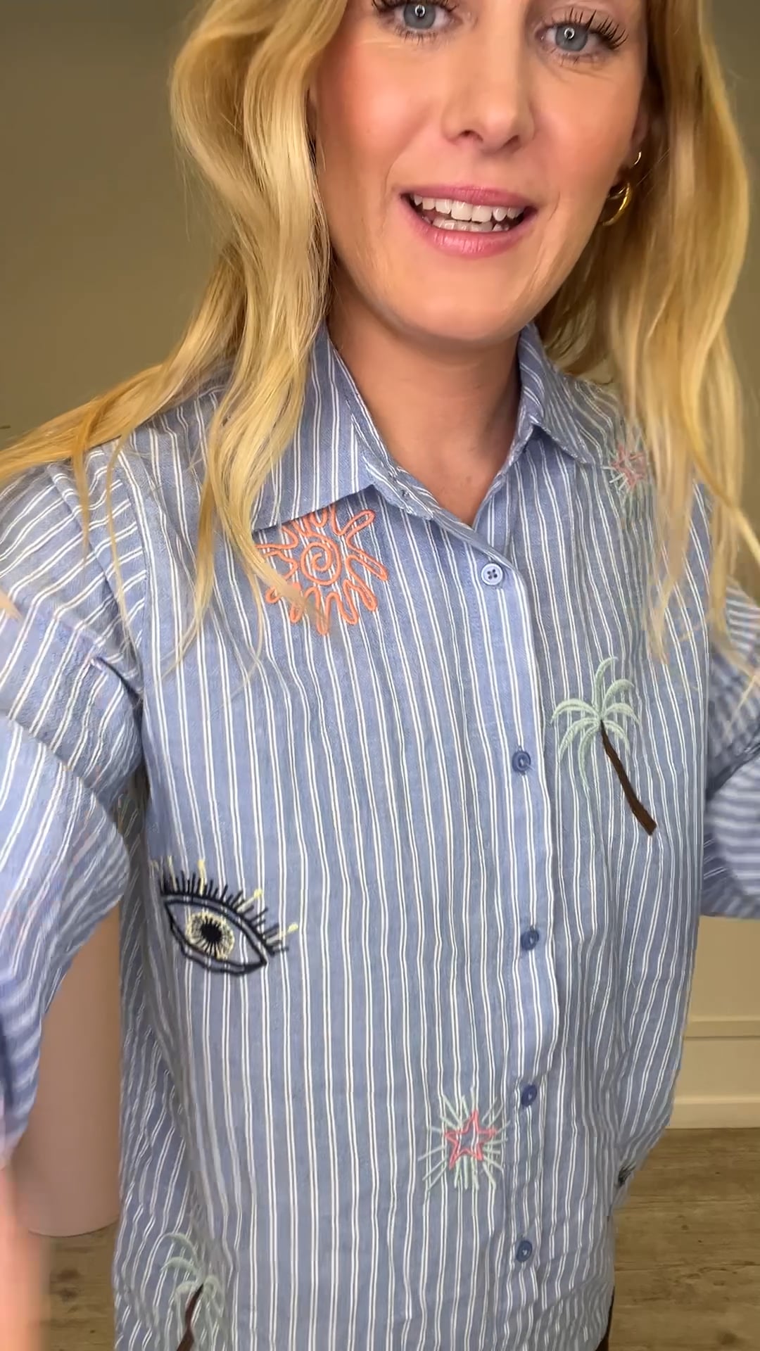 Denne skjorte har et frisk og legende udtryk med fine detaljer. Den er udført i lyseblå med smalle, lodrette hvide striber og har klassisk skjortekrave samt gennemgående knaplukning foran. Modellen har lange ærmer med manchetter og en let løs pasform, som giver et afslappet look. Skjorten er dekoreret med broderede motiver spredt over hele overfladen – blandt andet øjne, palmer, stjerner og grafiske figurer i kontrastfarver. Kombinationen af det klassiske stribede design og de farverige broderier giver skjorten et moderne, personligt præg.