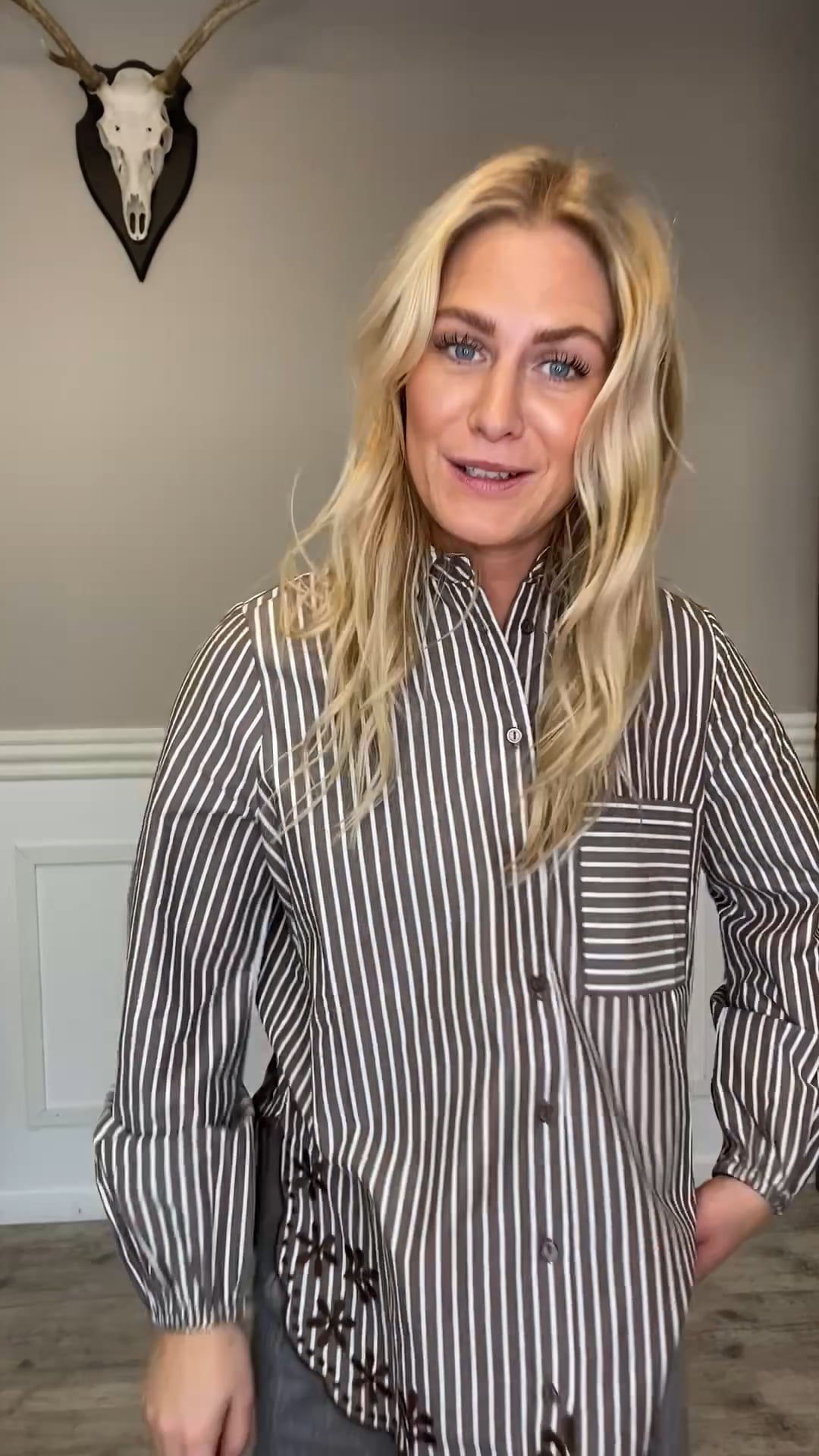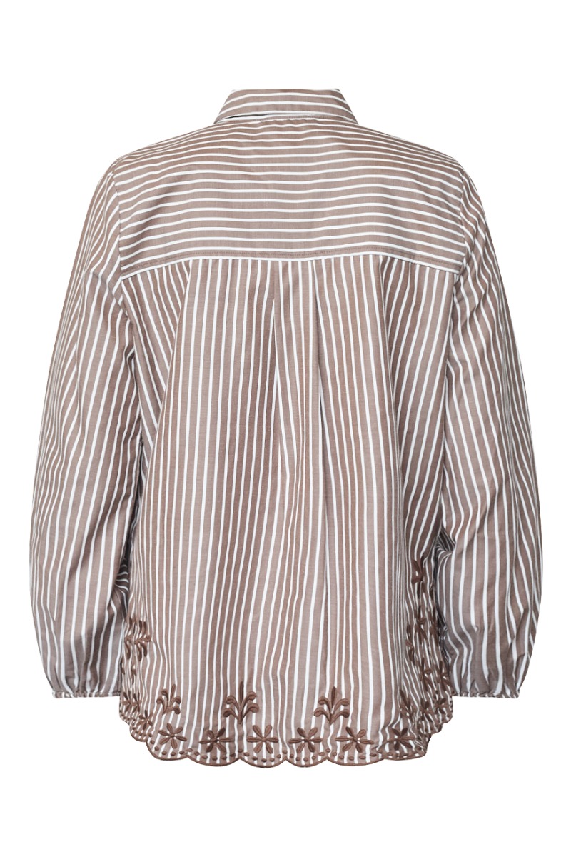 Denne stribede skjorte kombinerer klassisk design med feminine detaljer. Den er udført i et let materiale med lodrette hvide og brune striber, der giver et elegant og tidløst udtryk. Skjorten har en klassisk krave, knaplukning foran og en brystlomme med vandrette striber, som skaber en fin kontrast. Ærmerne afsluttes med elastik i manchetterne for et afslappet look. Nederst er skjorten dekoreret med smukke broderede blomster og en bølget kant, som tilfører et feminint og unikt præg. En alsidig skjorte, der både kan styles til hverdagsbrug og mere sofistikerede lejligheder.