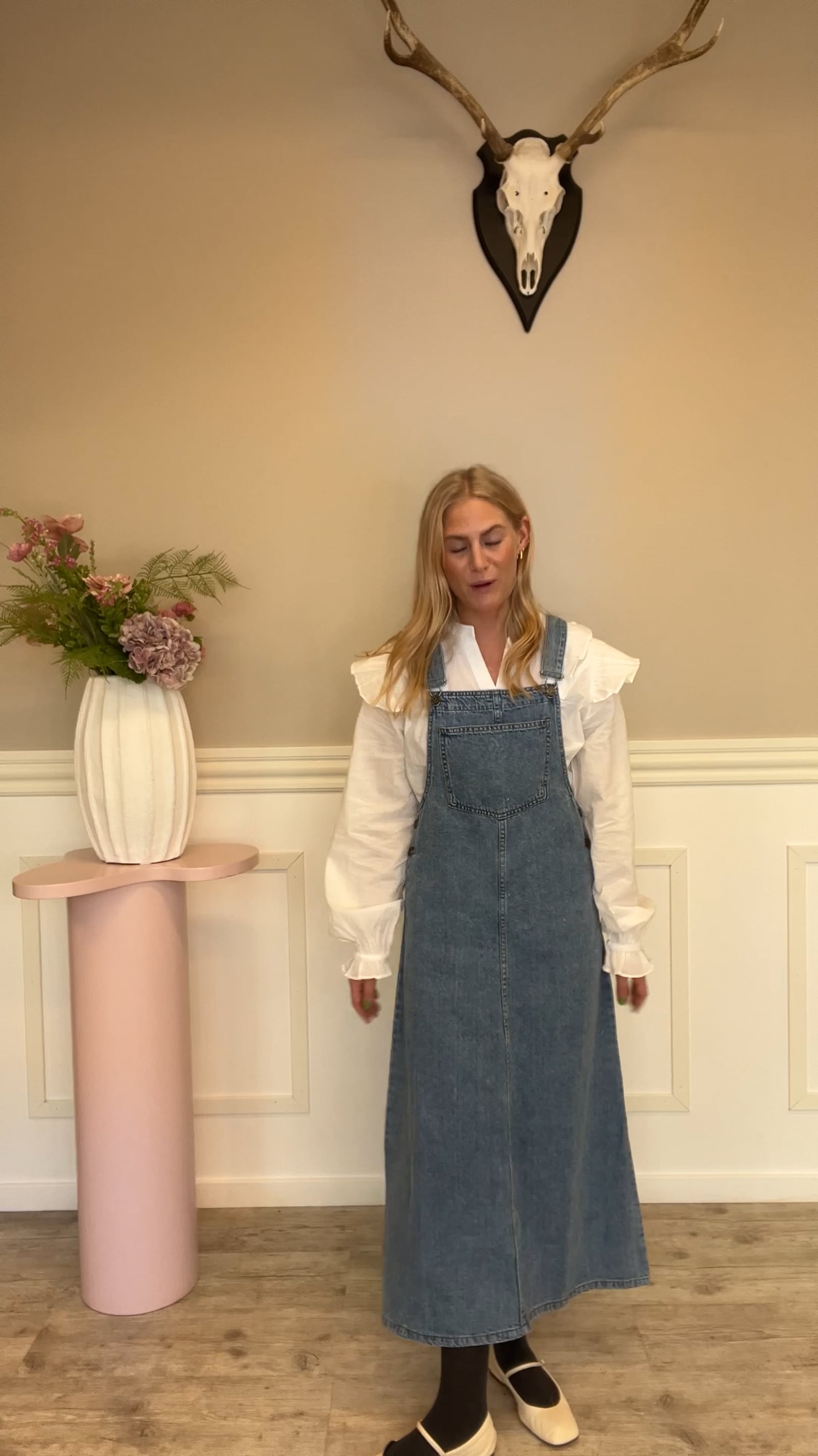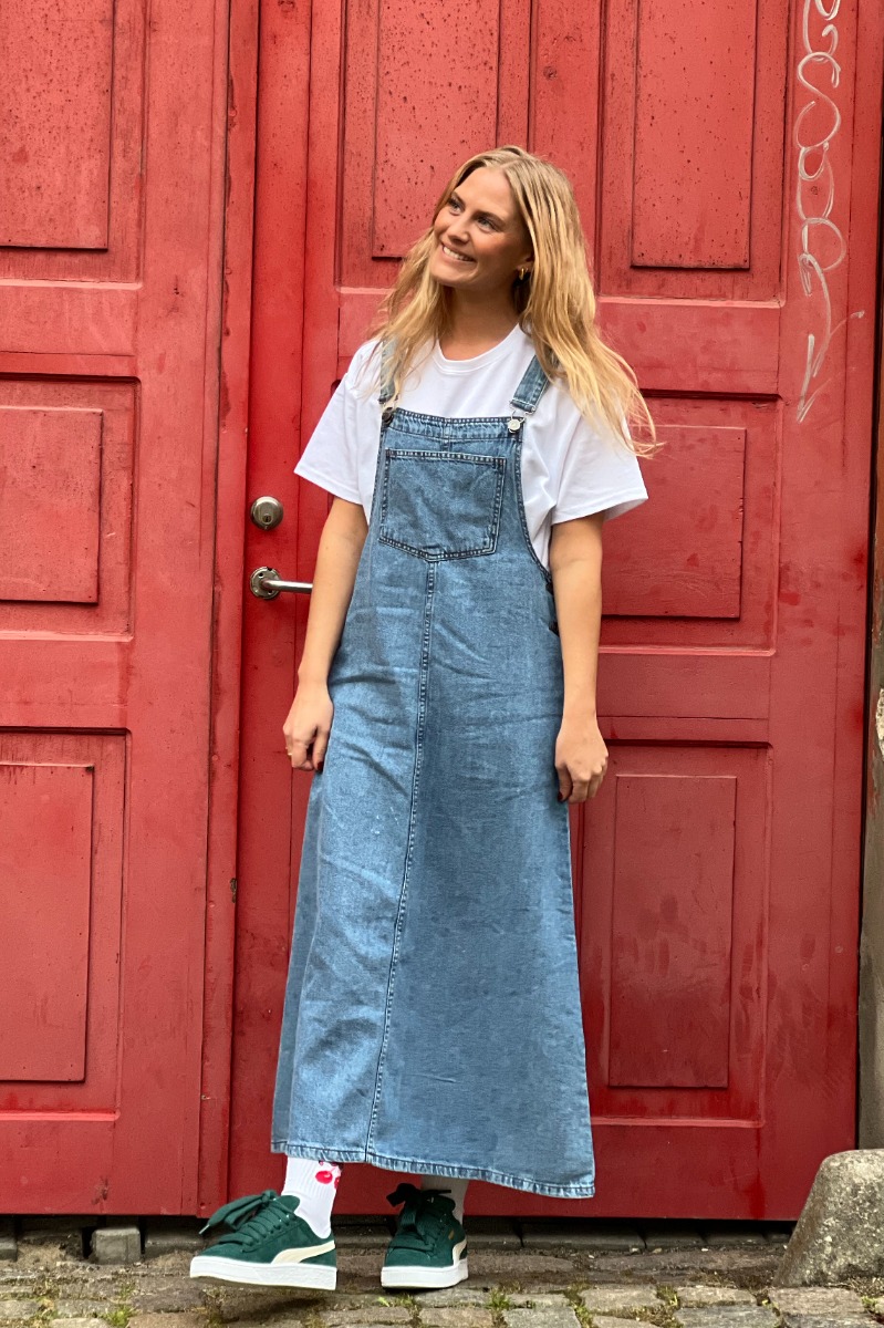 En fin spencerkjole i en lækker denim kvaliet fra Sisters Point. Den er med stropper som nemt kan knappes op og der kan også nemt bruges en t-shirt eller bluse under. Den er sej til hverdag med en par sneakers eller en loafer til.