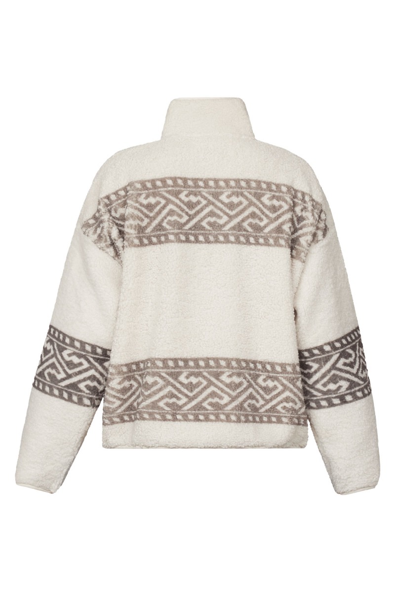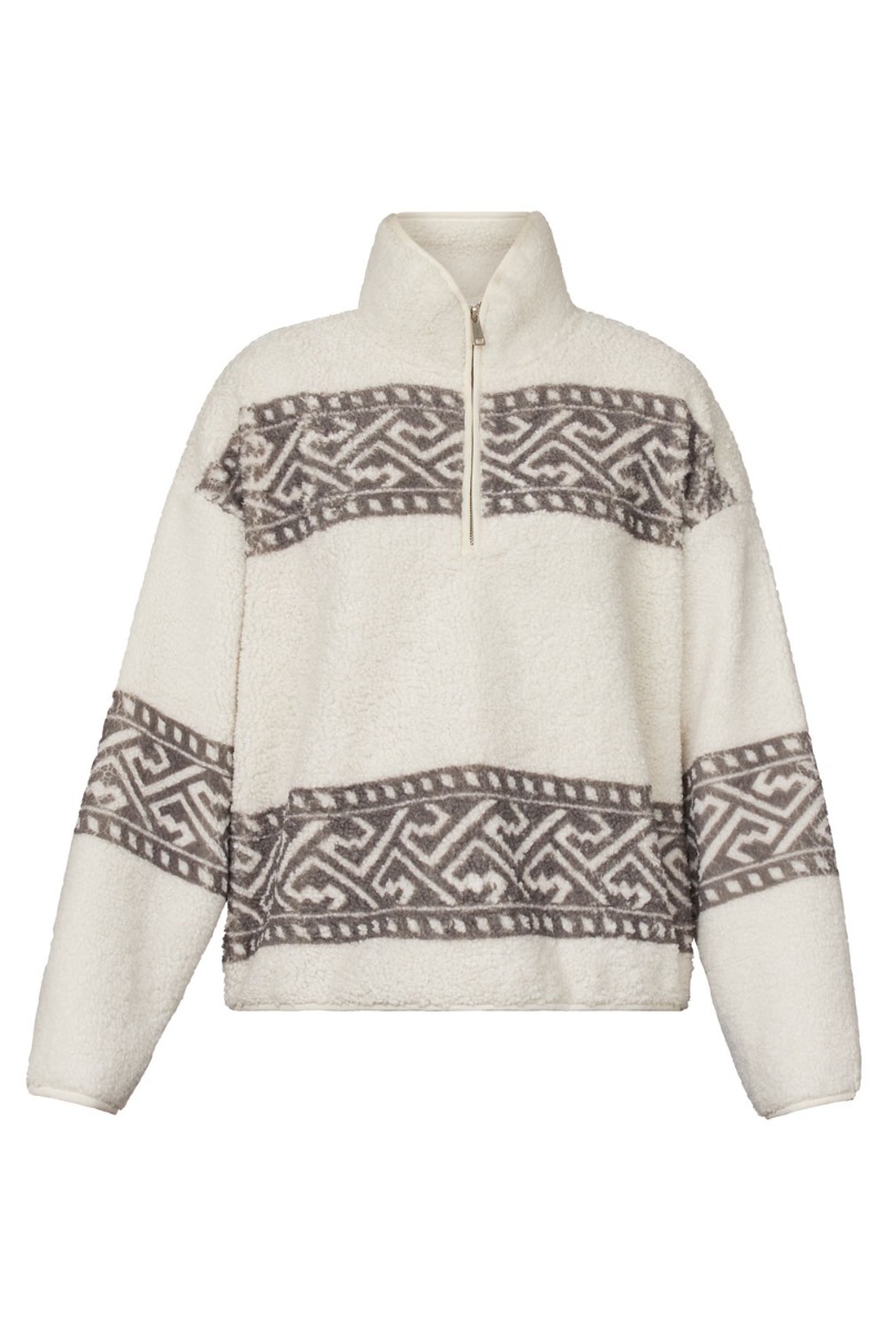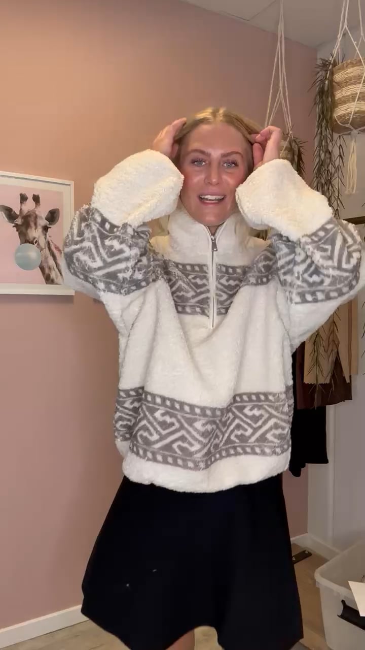 INTROTILBUD her fra Sisters Point. Den lækreste sweat/Fleece i et blød teddy materiale fra Sisters Point. Sweatshirten er beige , med et trendy islandsk lignende mønster henover brystet og nederst på trøjen. Den er med half zip lynlås og super dejlig blød at have på! Perfekt til nu og de koldere sommeraftener. En absolut favorit her ved Lykke by Lykke.