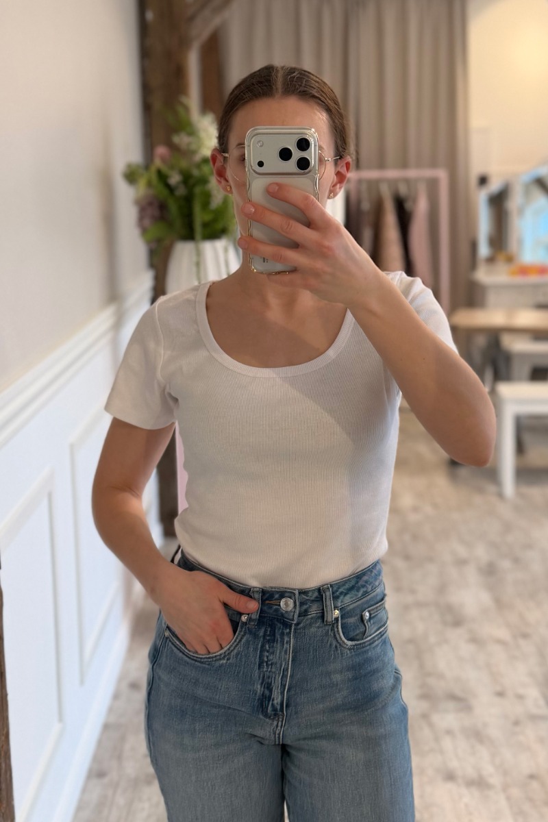 Enkel og feminin basis T-shirt i klassisk hvid, der passer perfekt ind i enhver garderobe. Den tætsiddende pasform fremhæver silhuetten og giver et stilrent og moderne udtryk. T-shirten er designet med korte ærmer og en rund halsudskæring, som giver et tidløst og afslappet look. Det bløde, ribstrikkede materiale gør den både behagelig og fleksibel at have på hele dagen. Perfekt som en alsidig basisdel – style den med jeans for et casual hverdagslook, eller brug den under en blazer, cardigan eller skjorte for et mere lagdelt og elegant outfit.