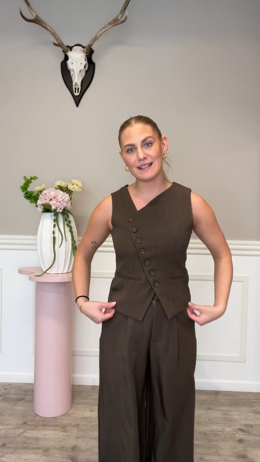 Denne vest fra Sisters Point har et tidløst og stilrent design med et moderne twist. Den asymmetriske knaplukning giver et elegant udtryk, mens den skræddersyede pasform fremhæver figuren på en flatterende måde. Den dybe, brune nuance tilfører varme og kan nemt kombineres med både lyse og mørke farver. Vesten har to dekorative frontlommer og et minimalistisk snit, som gør den ideel både til kontorbrug og til et mere afslappet look, alt efter hvordan den styles.