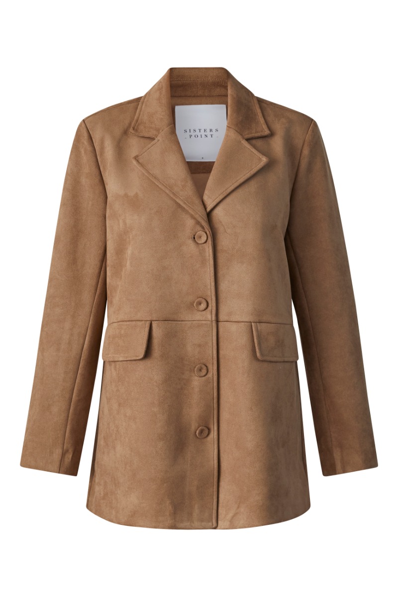 En sej blazer fra Sisters Point i ruskindslook er kommet i denne smukke brune frave. Den er lang i modellen og kan enmt bruges til hverdag med en skjorte eller til den matchende nederdel fra samme mærke. Den er også med lommer foran og er foret i dejlig let kvalitet.