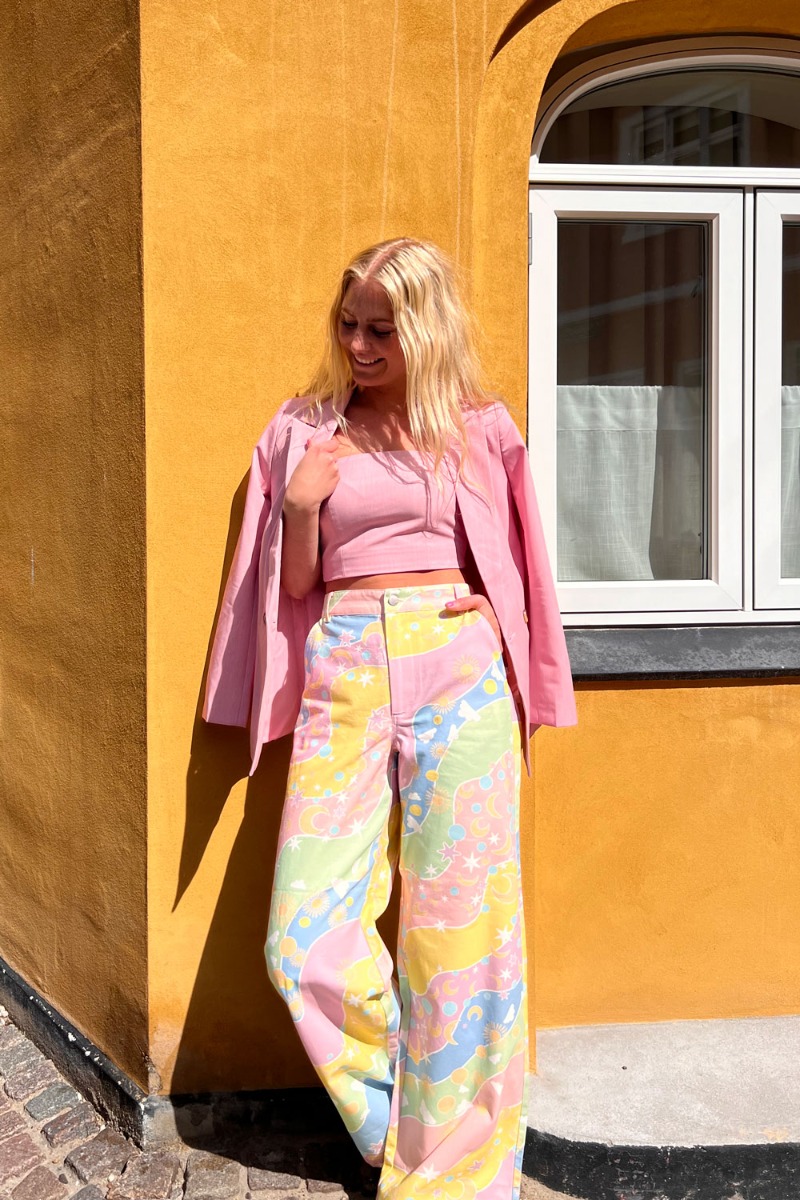 Disse jeans er simpelthen for seje. De har et bredt design med fast linning og lommer. De har et helt unikt grafisk mønster med stjerner, sole og måler der kun kan gøre en glad hvis du spørger os. Bukserne sidder super cool.