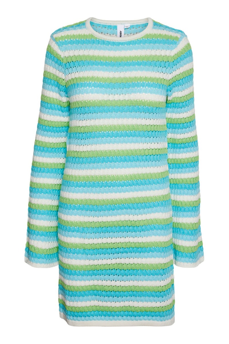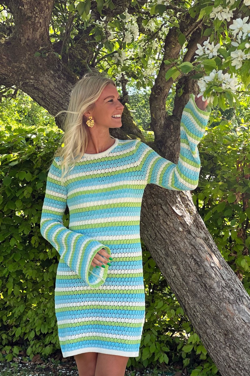 Wauw se lige den smukkeste hæklet kjole fra Something New! En skøn sommerlig kjole i stribet mønster med nuancer af hvid, grøn og blå. Kjolen har en løstsiddende pasform i et knælangt snit med lange vidde ærmer og rund halsudskæring. Styl den til sommeren med både sneakers, sandaler og et par rå støvler.
