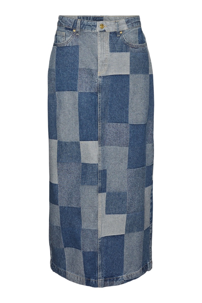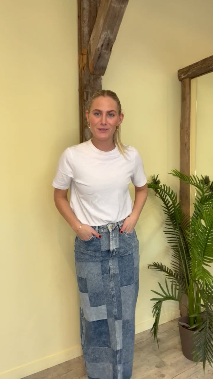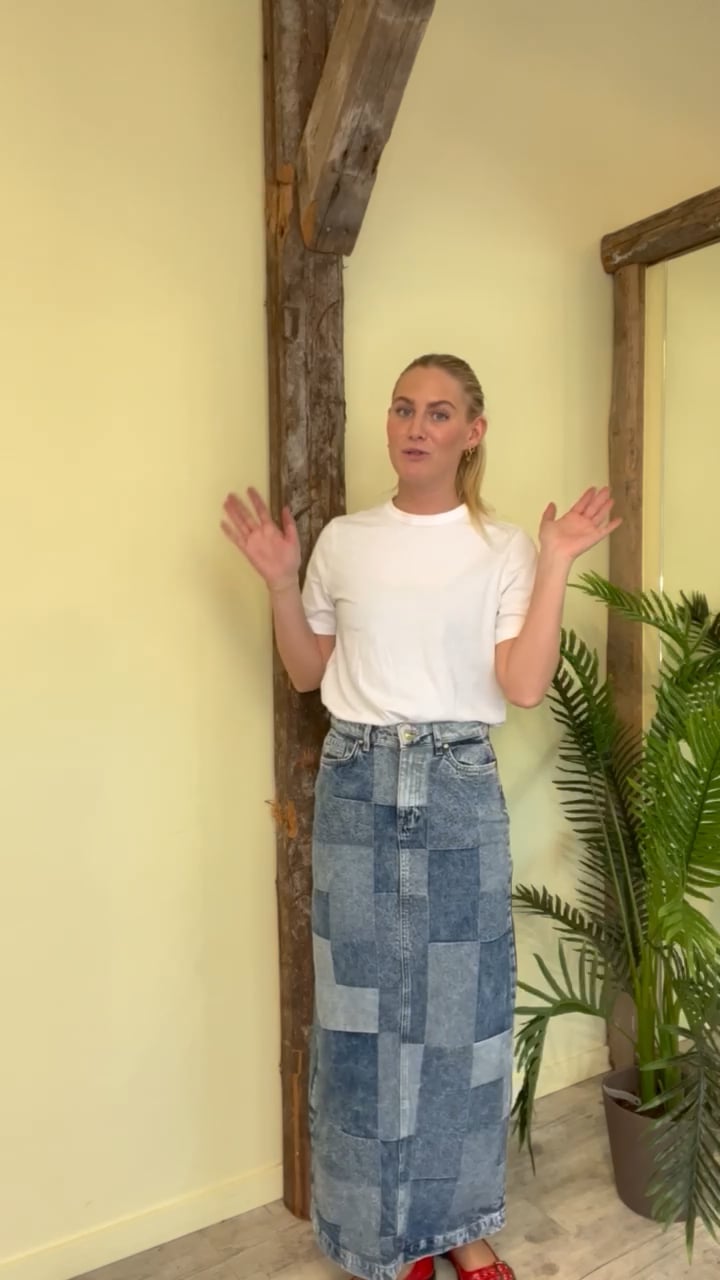 En sej nederdel fra Something New er kommet i et cool denim mønster. Det er i et ternet patchwork mønster i blå nuancer. Derudover er den kraftig i kvalitet og med slids bagpå i bunden. Den er fin sammen med en sweatshirt eller til en simpel t-shirt der er pyntet op med smykker.