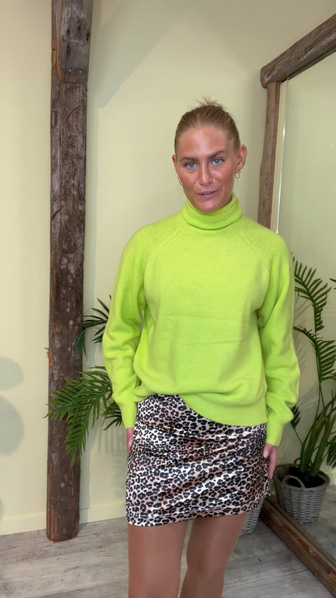 Det sejeste lille mini skirt fra Something New i et cool leopard print! Nederdelen er i en lækker strækbar kvalitet, som gør at den virkelig er skøn at have på i materialet. Derudover er der en fast linning i livet og en skjult lynlås i siden. Style evt. den seje nederdel med den seje Marie strik i limegrøn fra samme kollektion!