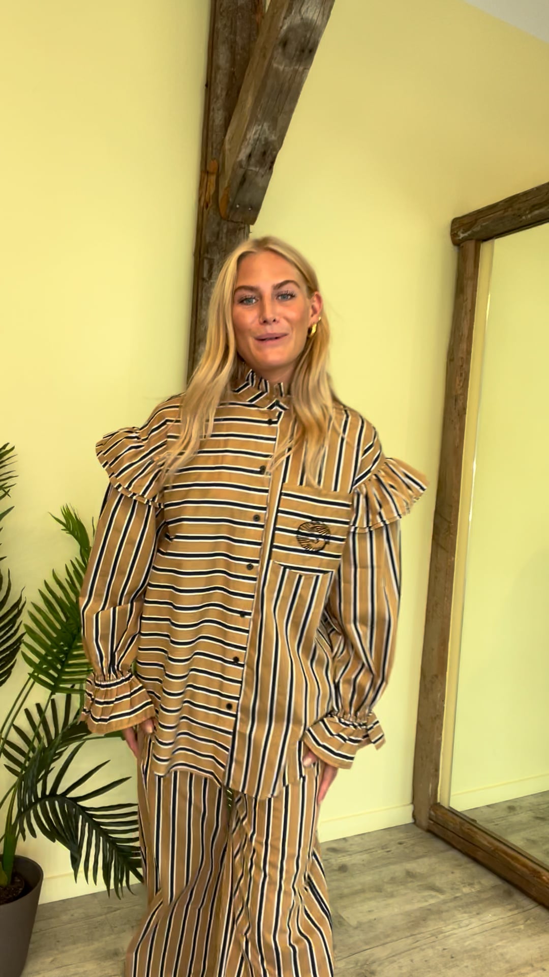 En sej buks fra Stories From The Atelier by Copenhagen Shoes med striber i beige, sort og hvid. Den er løs i pasformen med vide i benene og elastik i taljen. Den er nem at styles til den matchende skjorte som også er lavet i denne lækre tynde kvalitet. Hele sætte findes og med striber i en mørkere brun.