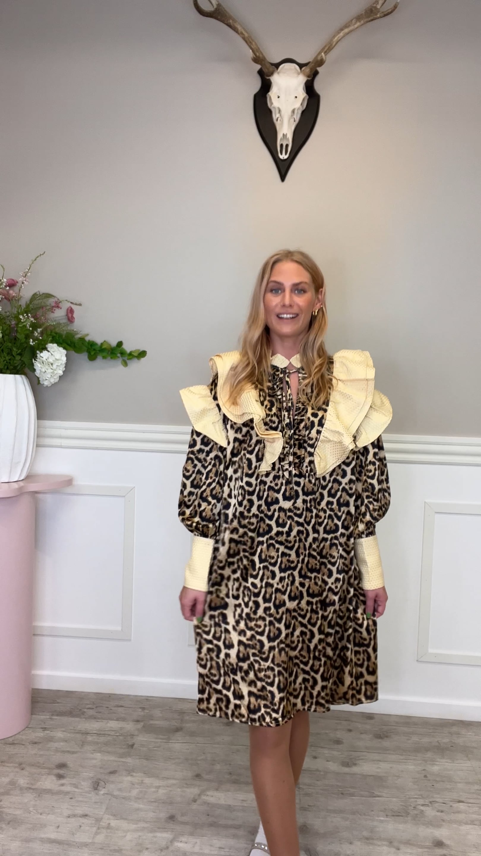 En SUPERCOOL leopardkjole er landet her fra Stories From The Atelier. Denne kjole er bred og rummelig i pasformen, bindes i halsen og så har den de flotteste flæsedetaljer i en fin beige nuance. Denne kjole er helt perfekt til fest, men kan også sagtens bruges til hverdag eksempelvis til et par sneakers eller støvler.