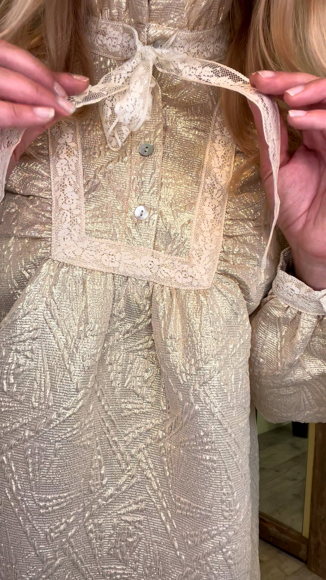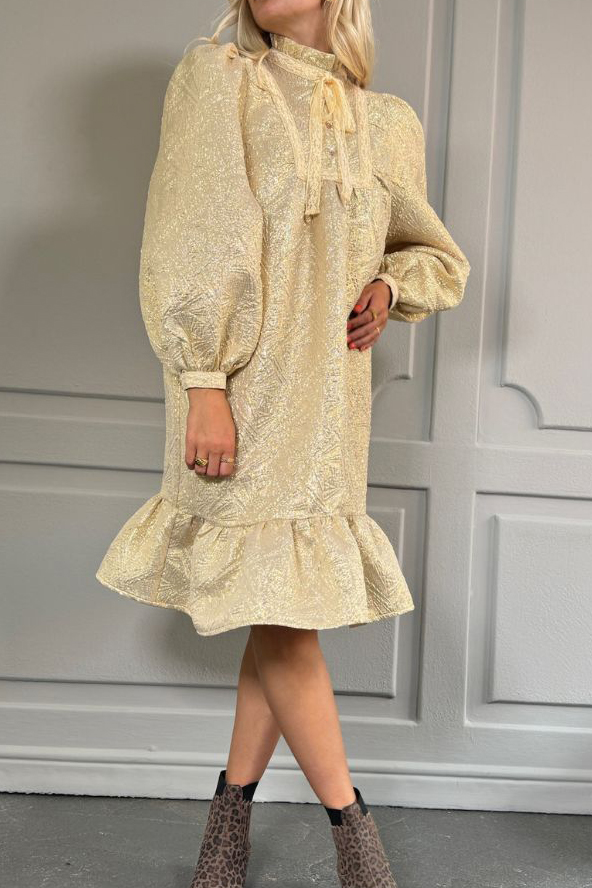 Den smukkeste kjole er landet fra Stories From The Atelier by Copenhagen Shoes i en guldfrave. Den er løs i pasformen og har smukke og feminine detaljer som flæser og blondekanter. Den kan nemt bruges sammen med en stilet til fest og virkelig stå for sig selv uden en masser smykker og andet bling.
