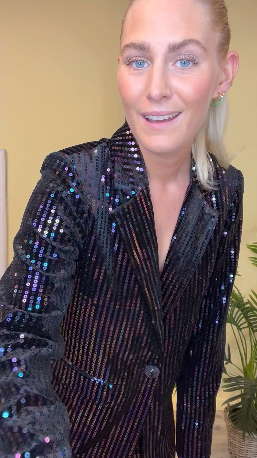 Den smukkeste blazer er kommet fra Y.A.S med pailetter i lilla og blå nuancer. Den er lange i modellen og løs i pasformen, derfor er den pæn både lukket og åben. Den er foret med en glat kvalitet så den ikke kradser og er behagelig at have hele dagen. Derudover findes der et par matchende bukser.