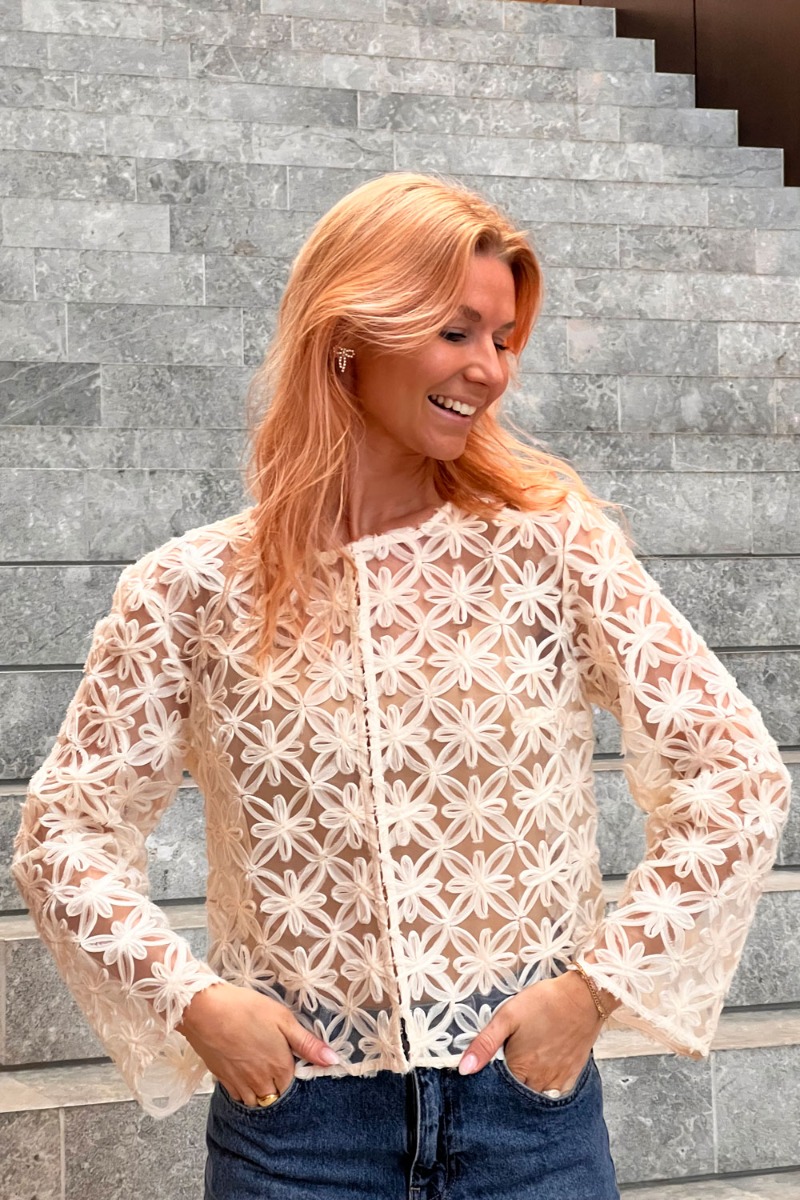 En fin tynd jakke fra Y.A.S er kommet i en råhvid farve. Den er gennemsigtig og derfor anbefaler vi at du bruger en top under. Den lukeks foran med hægter og har dette blomsterprint og 3D effekt i stoffet. Den er fin til at pifte et ellers neutralt outfit op.