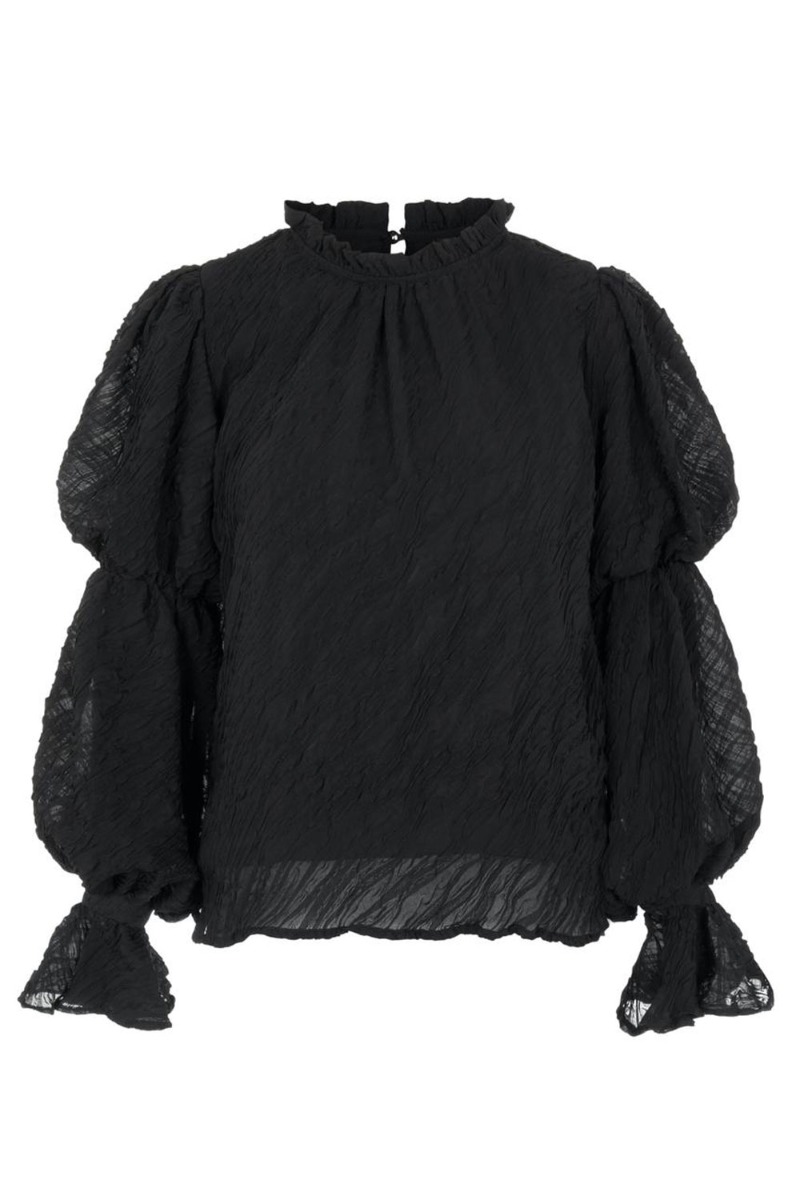 Vi ved i kommer til at elske denne bluse fra Y.A.S. Vi havde den sidste jul i rosa med prikker og nu har vi skaffet den i en helt enkelt smuk sort med struktur. Den har læg-på-lag ærmer og flæsekrave der lukkes i nakken. Blusen er utrolig smuk bare at style med et par sorte bukser.