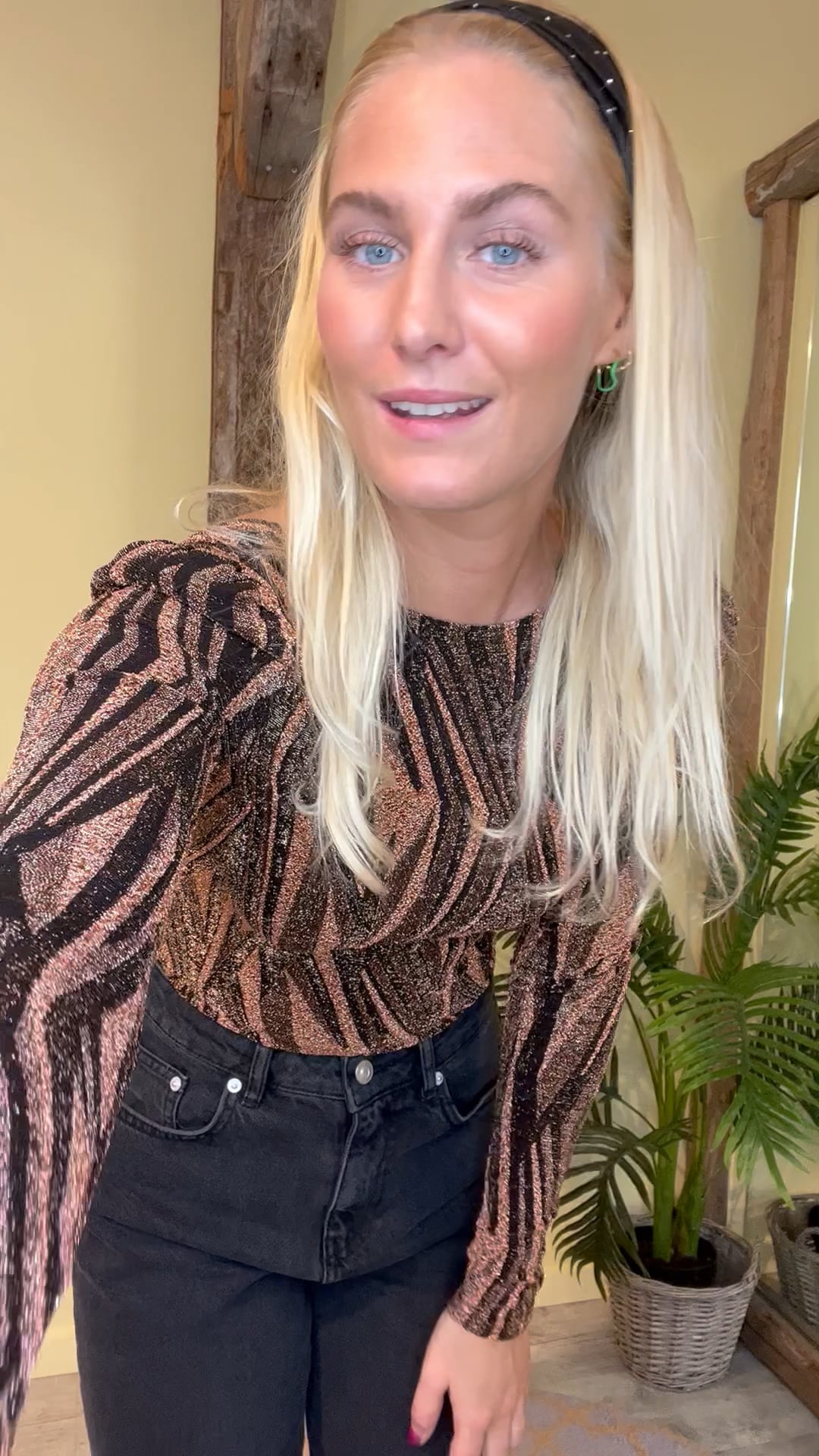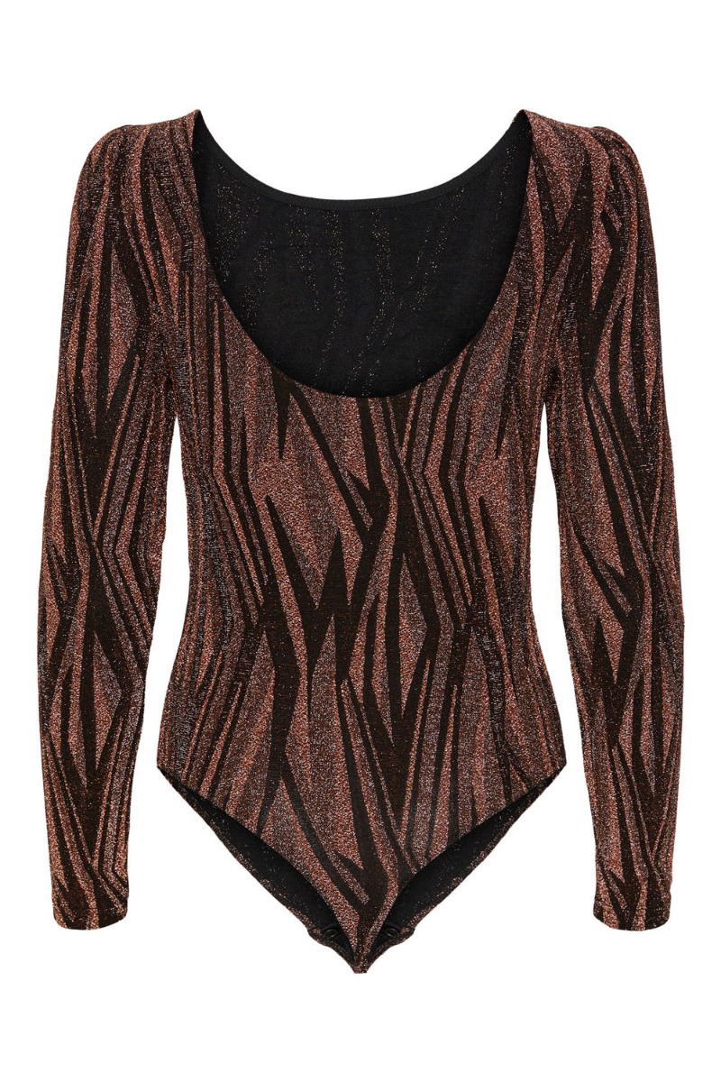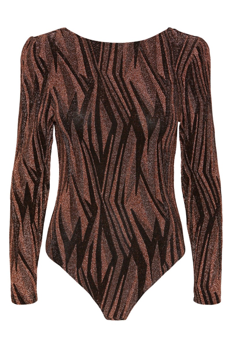 Den fineste bodystocking er kommet fra Y.A.S i en smuk kobberfarve. Den er stribet med denne kobber farve og sort hvir der er glimmereffekt i stoffet også. Den. har dyb ryg med lange ærmer med en anelse puf ved skulderen. Den lukkes i bunden med trykknapper og er i G-streng model i bunden også.