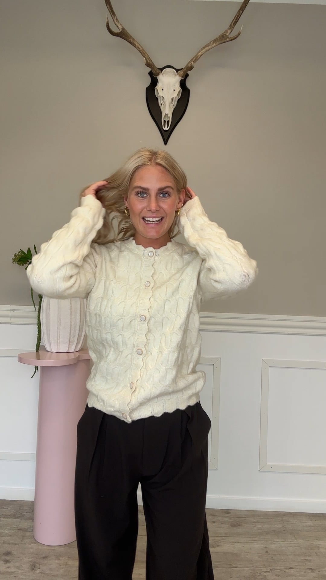 En fin cardigan i en kabelstrik fra Y.A.S. Denne cardigan har en behagelig, løs pasform og fine knapper, samt bølgekant ved ærmer og krave. Den er perfekt til garderoben til den kommende årstid!