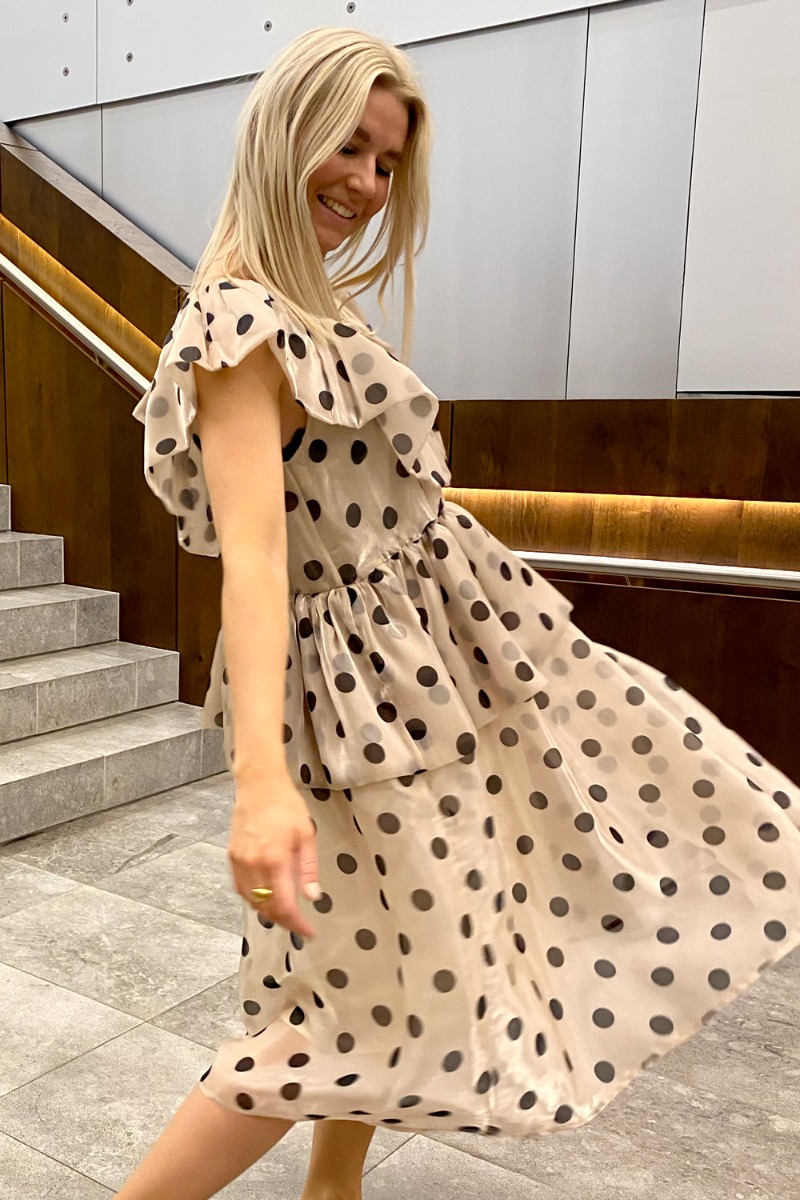 PIGER!! Nu har du muligheden for at klikke den flotteste Y.A.S kjole hjem med dette flotte prikket mønster i sort. Kjolen er sandfarvet og spiller helt fantastisk sammen med kjolens print og unikke detaljer. Der er store flæser, der går fra skuldrene og frem foran kjolen og danner en V-halsudskæring. Flæsen går også rundt på bagsiden og også her er der samme V-udskæring, der viser din øverste ryg og nakke. Kjolen har desuden et flæsestykke i taljen, der gør den SÅÅÅ elegant og fin. Der er sandfarvet underkjole indenunder og så er der ingen ærmer på, men flæsedetaljen skjuler det øverste af skuldrene.