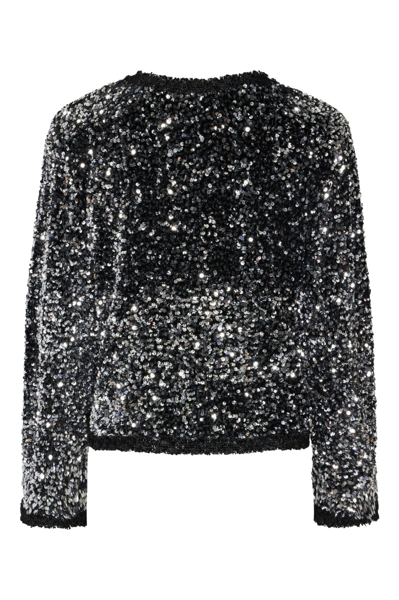 En festlig jakke fra Y.A.S. Denne jakke er designet med palietter, som giver et super festligt touch. Den lukkes med tre sløjfer, som har sten i sort og sølv. Brug den som jakke til et festligt outfit eller som en bluse evt. med en top under.