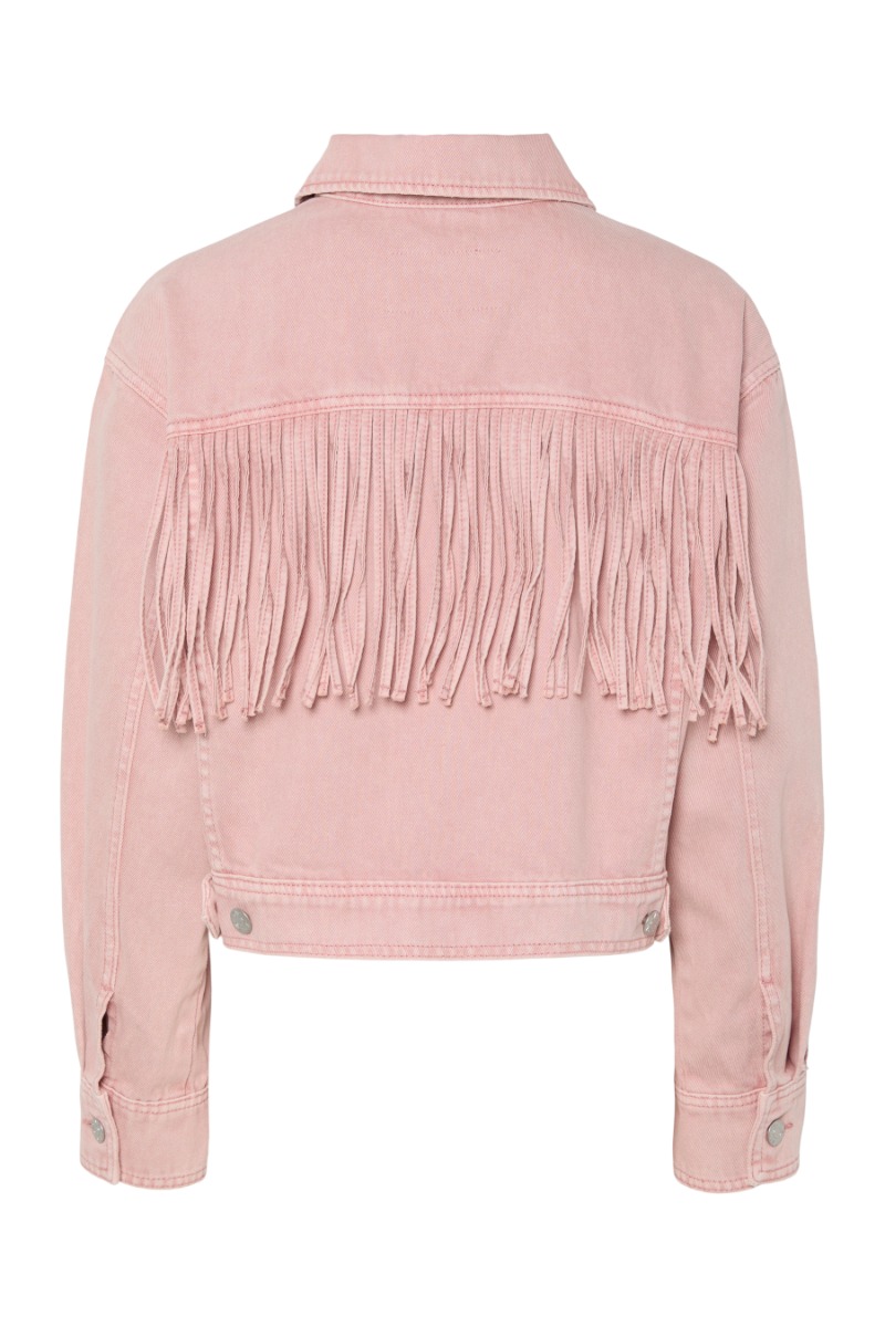Feminin denim jakke fra Y.A.S. Denne jakke har en sød lyserød farve. Den har en lomme foran og frynser bagpå! Den er mega sej til sommerens festivaler, fester m.m.