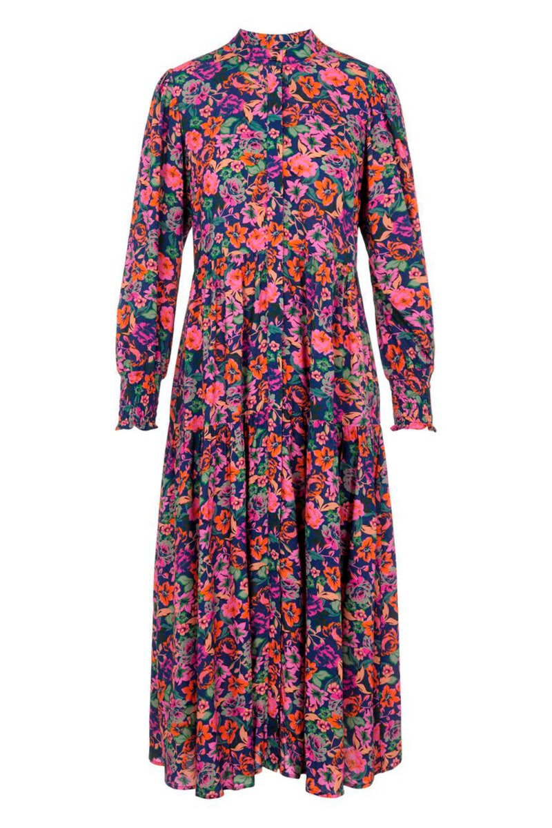 Smuk lang kjole fra Y.A.S i farverigt blomsterprint. Kjolen har lange ærmer med smok detalje ved håndledet. Den knappes hele vejen ned foran med skjulte knapper er skåret i taljen for en flot pasform. Selve skørte er med peblumeffekt og flader virkelig smukt.