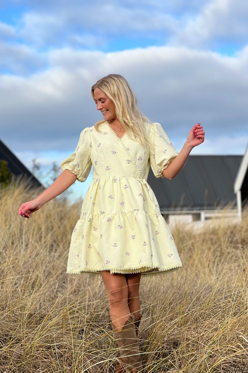 Smukkeste lysegule kjole fra Y.A.S. En vaskeægte LYKKE kjole med små lyserøde broderi kirsebær. Det er en klassisk slå-om kjole i et crepe materiale som giver en flot volume i kjolen. I kanterne har den en flot blondekant som giver en fin og feminim effekt. En super smuk kjole til en festanledning!