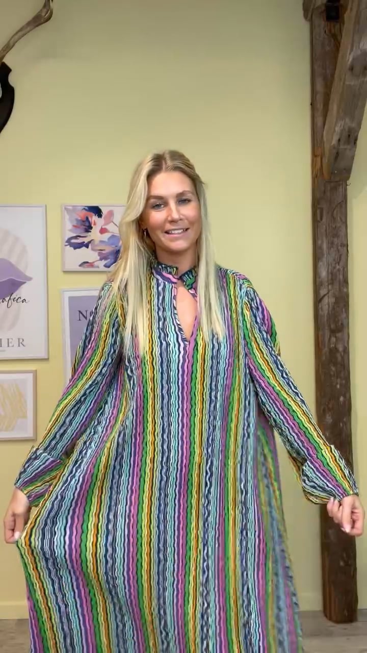 Fin kjole fra Y.A.S med striber i smukke farver. Kjolen er med en dråbeformet udskæring ved halsen, som spændes med en knap.