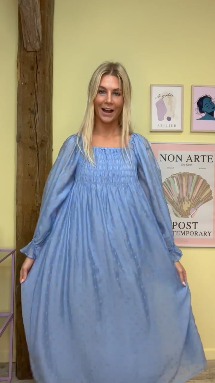 Fineste kjole fra Y.A.S i smuk blå farve med prikker og smockeffekt ved brystet.