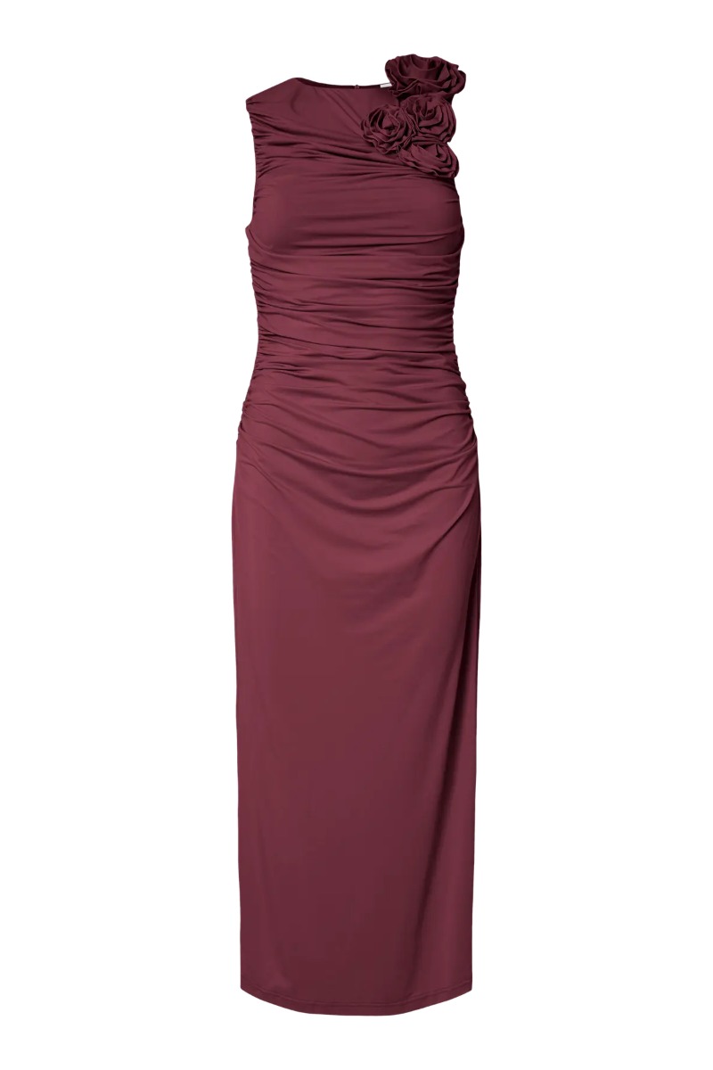 Smukkeste lange kjole i bordeaux. Kjolen er fra Y.A.S og har de fineste detaljer i form af blomster på den ene skulder og sygninger i siden og i ryggen der giver den flotte "rynke" effekt. Den sidder tæt omlring kroppen og har et slidt bagpå. Findes også i blå.